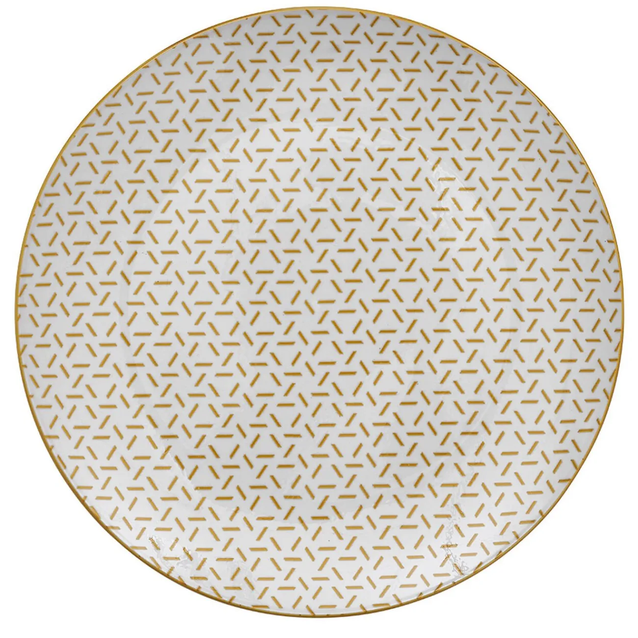 Set de 4 assiettes plates en porcelaine blanche avec contour et motifs petits traits colorés formant des triangles, idéal pour créer des mélanges de couleur sur votre table.