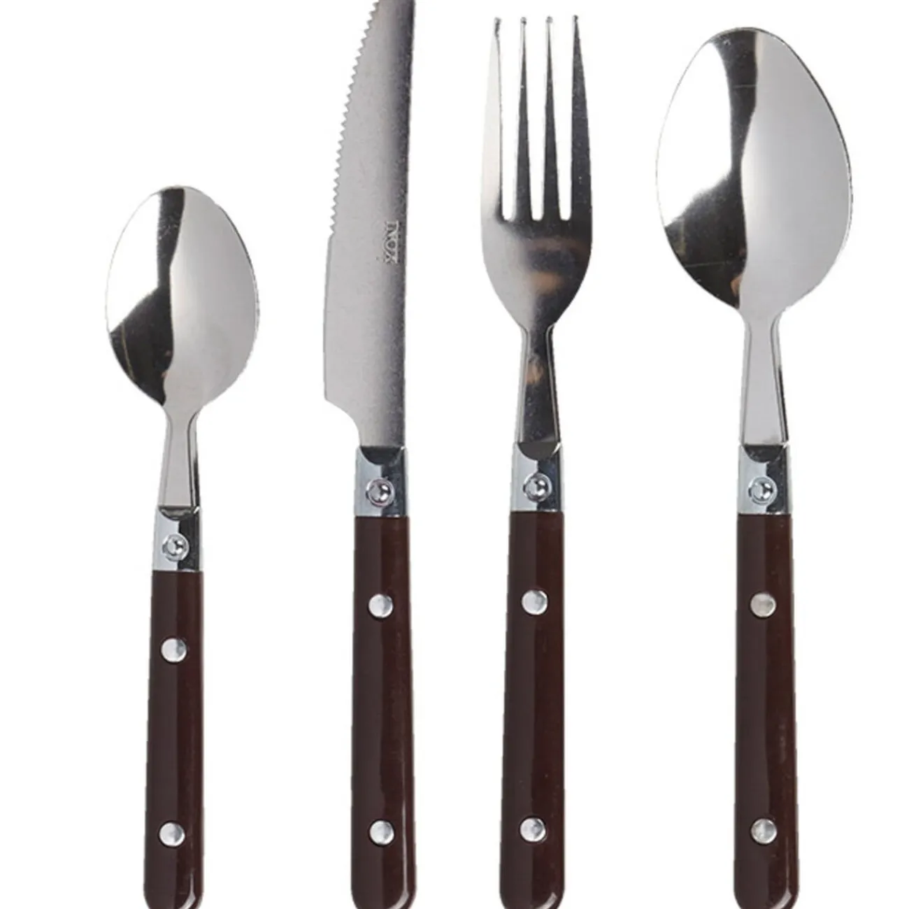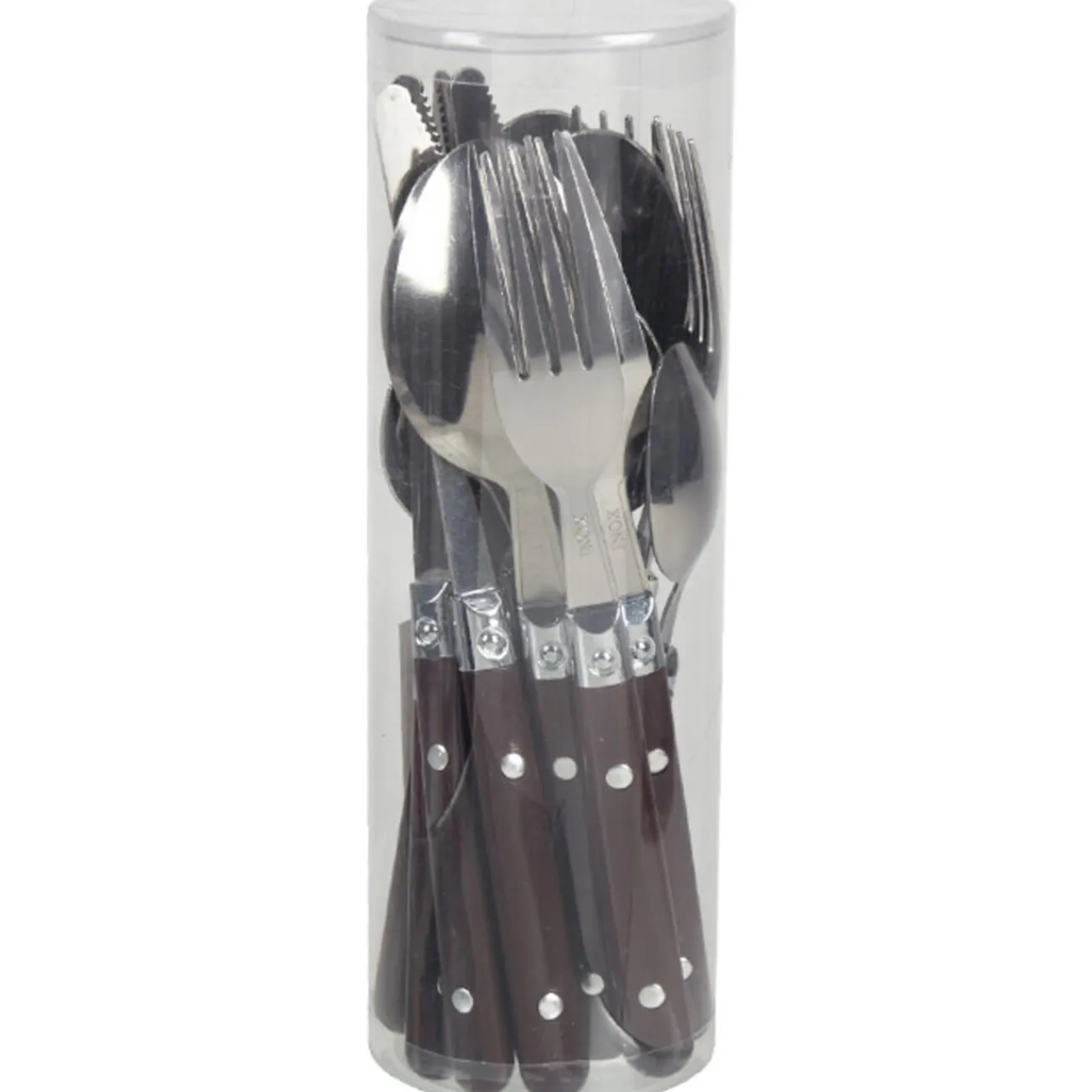 Ménagère 16 pièces chocolat comprenant 4 fourchettes, 4 cuillères à soupe, 4 couteaux et 4 cuillères à café, inox, manche plastique.