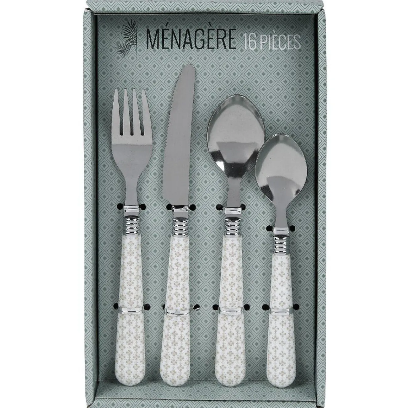 Ménagère de 16 pièces en métal gris et manche design oreige comprenant 4 fourchettes, 4 couteaux, 4 cuillères à soupe et 4 cuillères à café.