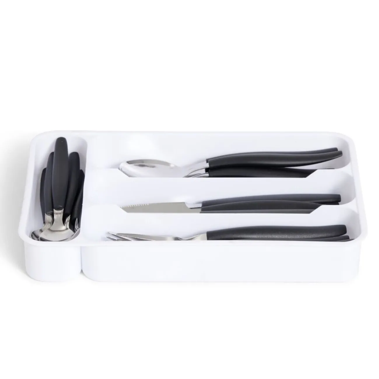 Un range-couverts en plastique blanc, spécialement conçu pour cette ménagère, est inclus pour un stockage facilité et une meilleure organisation.