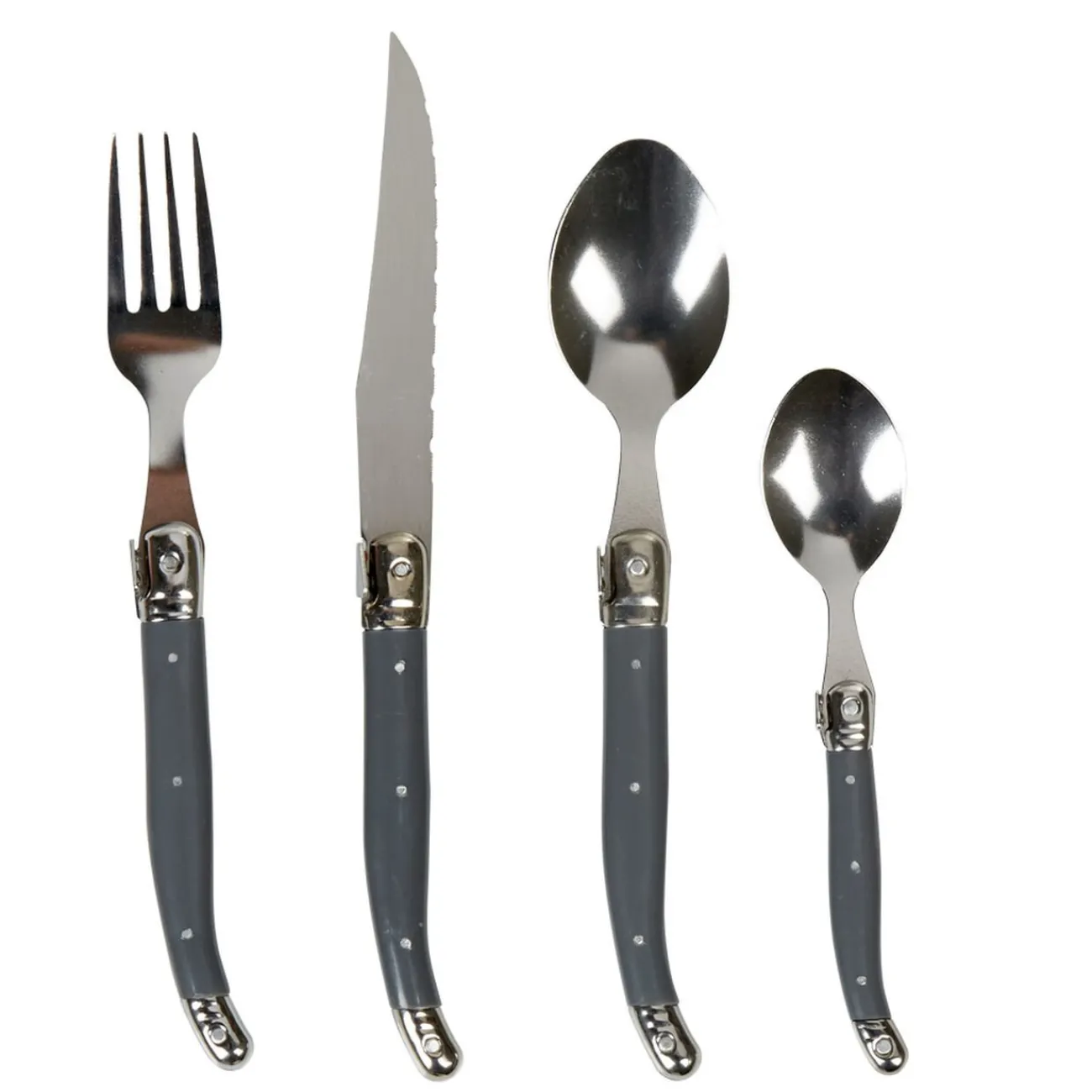 Ménagère 24 pièces en inox et manche en plastique gris.