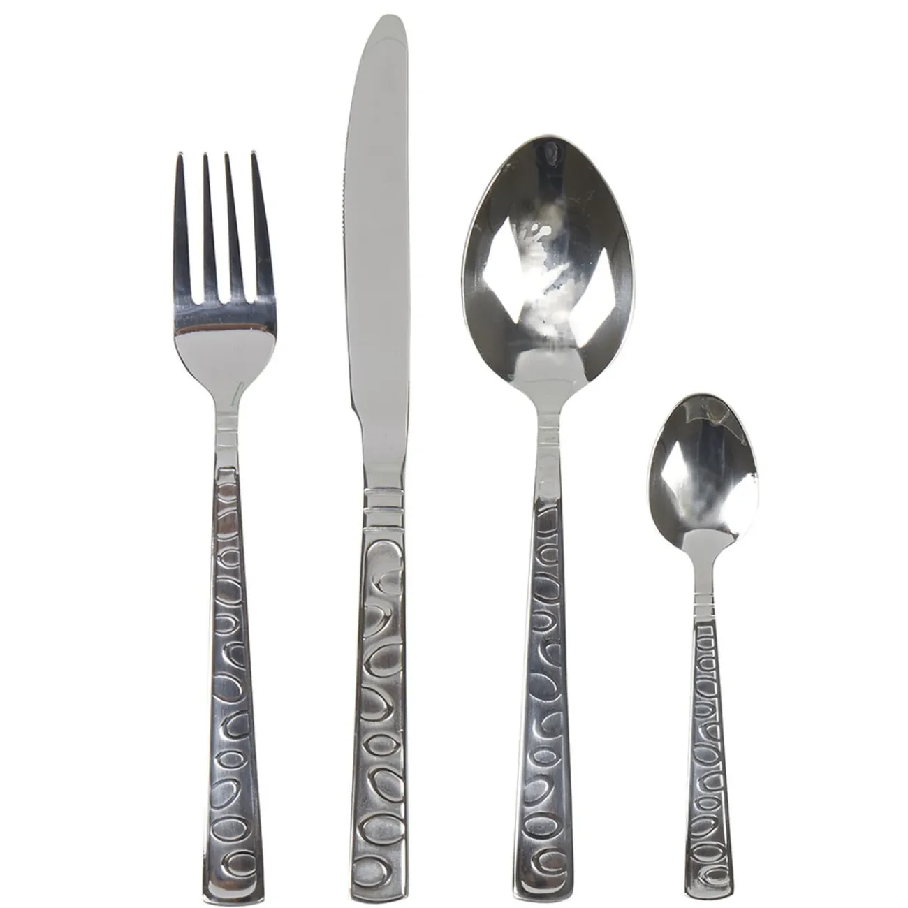 Ajoutez un peu de fantaisie à votre table avec cette ménagère de 24 pièces avec 4 fourchettes, 4 couteaux ronds, 4 grandes cuillères et 4 petites cuillères avec strilles en relief.