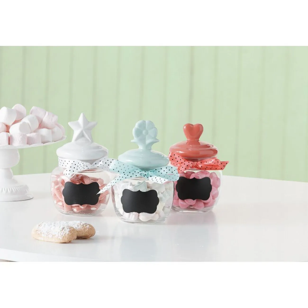 Bonbonnière ardoise + craie. Ce produit existe en 3 modèles: blanc/rouge/bleu, modèles aléatoires selon disponibilité en magasin. -Dimensions: l 11,2x L 11,2 cm xH8,5 .
