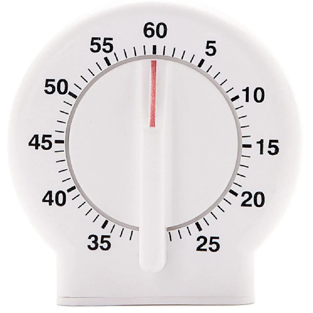 Minuteur de cuisine blanc d’une durée de 60 minutes maximum.
