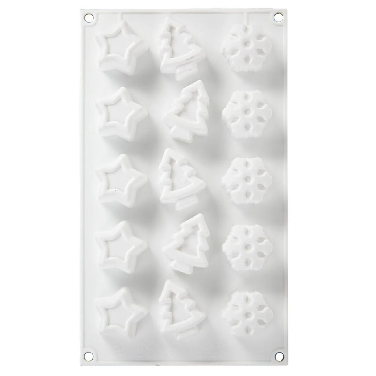 Moule en silicone avec 15 empreintes de formes différentes: sapins, étoiles, flocons.