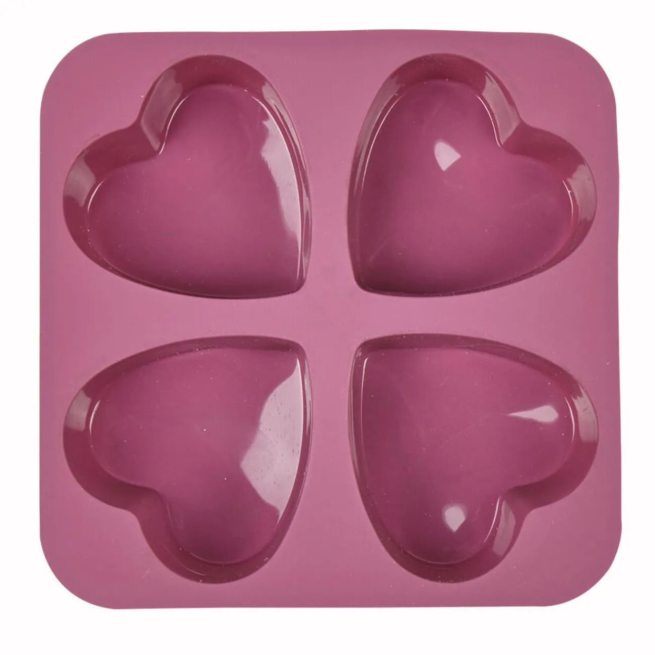 Moule en silicone 4 coeurs dim. 6,5x7xh.3 cm, planche dim. 16×16 cm. Cuisson four et Micro-ondes, passe au lave-vaisselle, + 220°C, – 20°C.