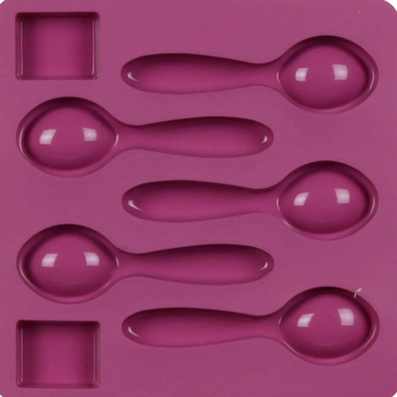 Moule silicone pour 7 chocolats (5 cuillères dim. 3×10,5xh1 cm et 2 carrées dim. 3,5x3xh1,5 cm), cuisson four et Micro-ondes, passe au lave-vaisselle. Diff. coloris, disponibilité selon arrivage.