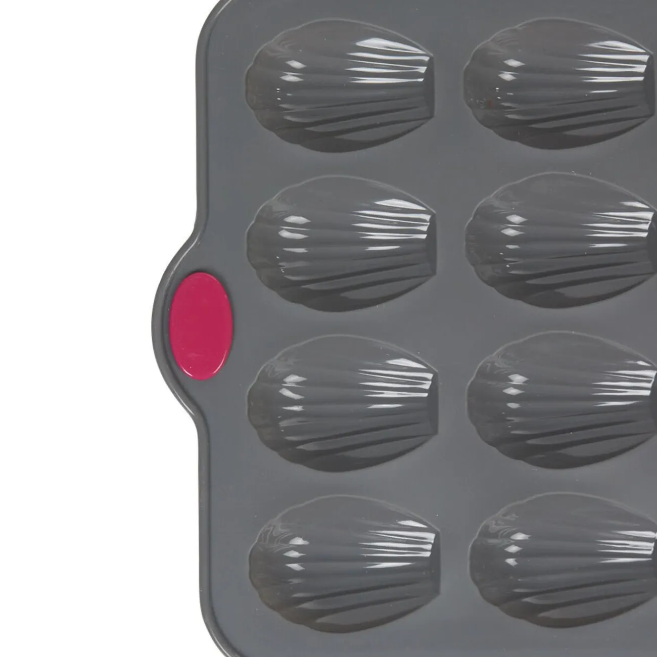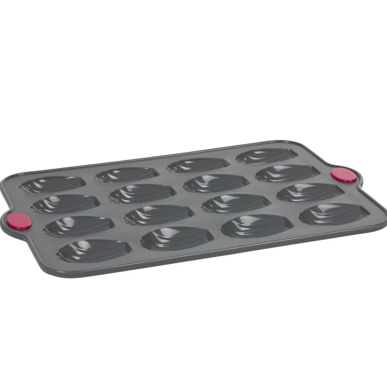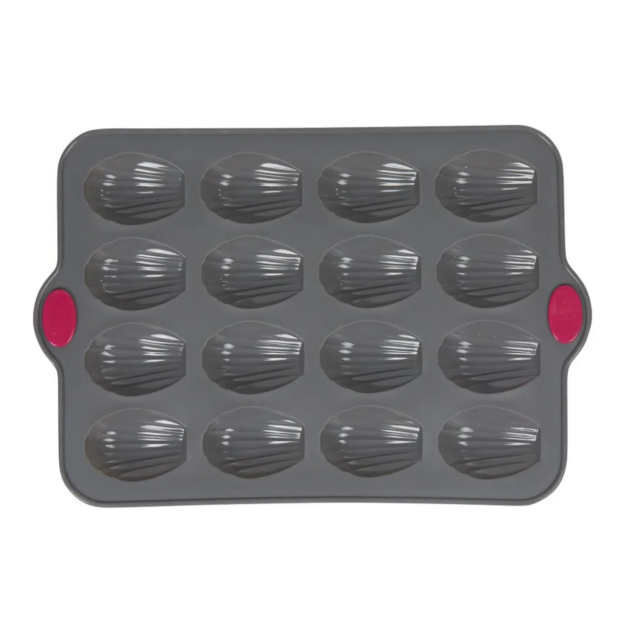 Moule en silicone gris pour la cuisson de 16 madeleines avec armature rigide en acier pour une meilleure stabilité et prise en main.