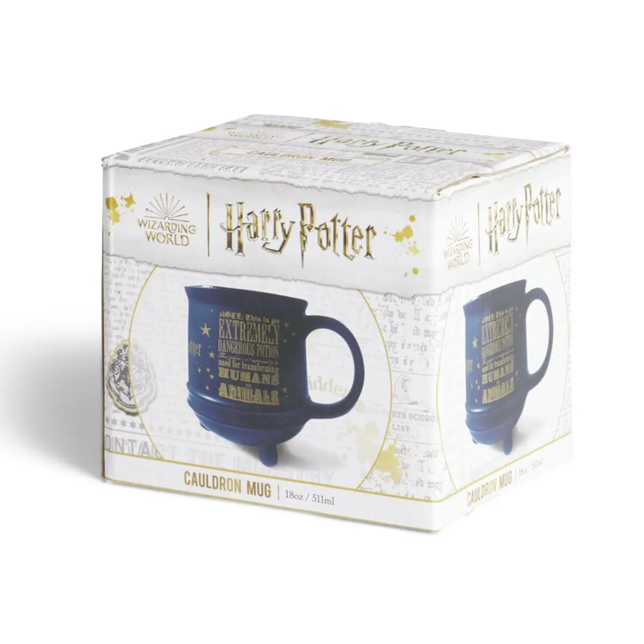 Concoctez de délicieuses potions magiques avec ce mug Harry Potter en forme de chaudron orné de motifs et inscriptions bleus et dorés.