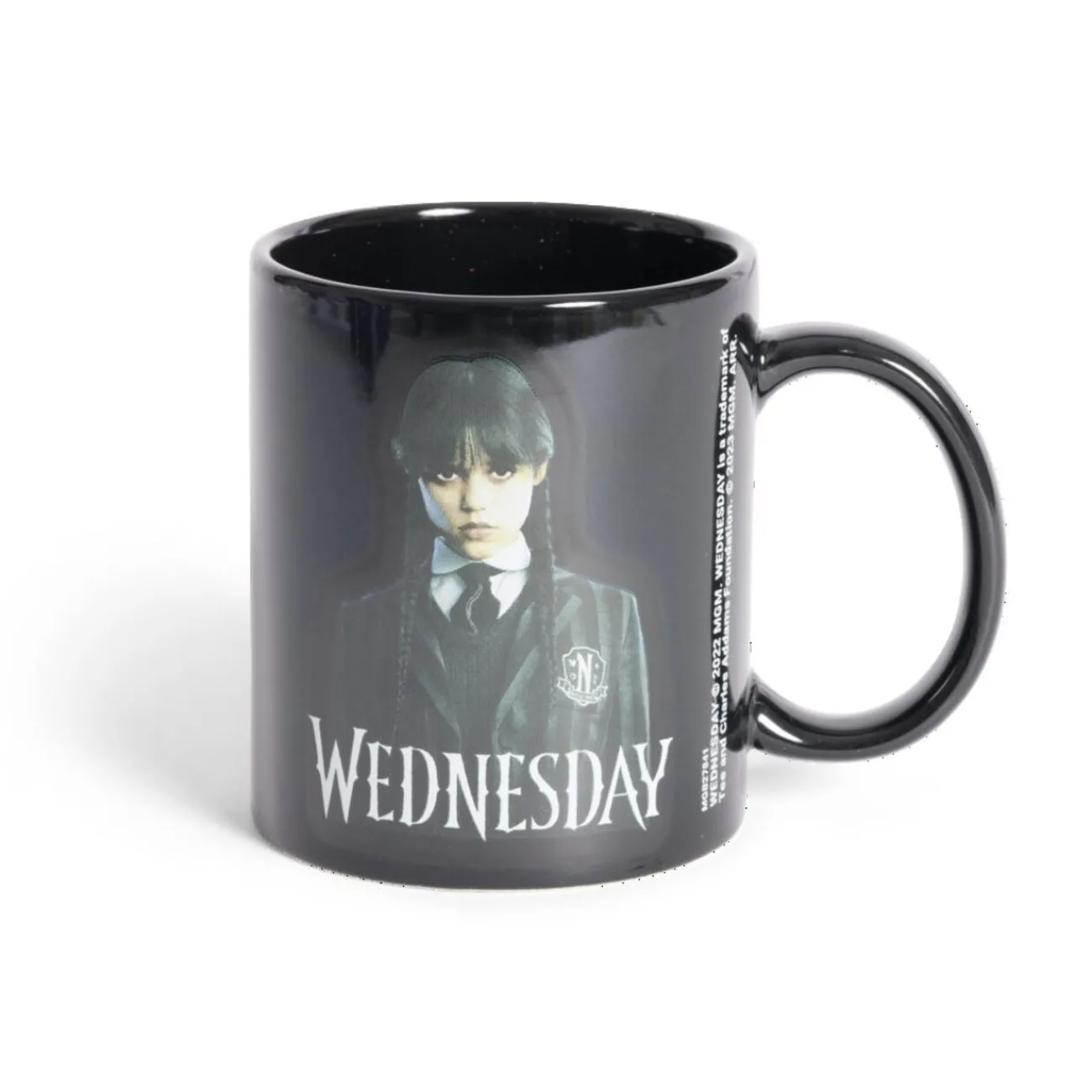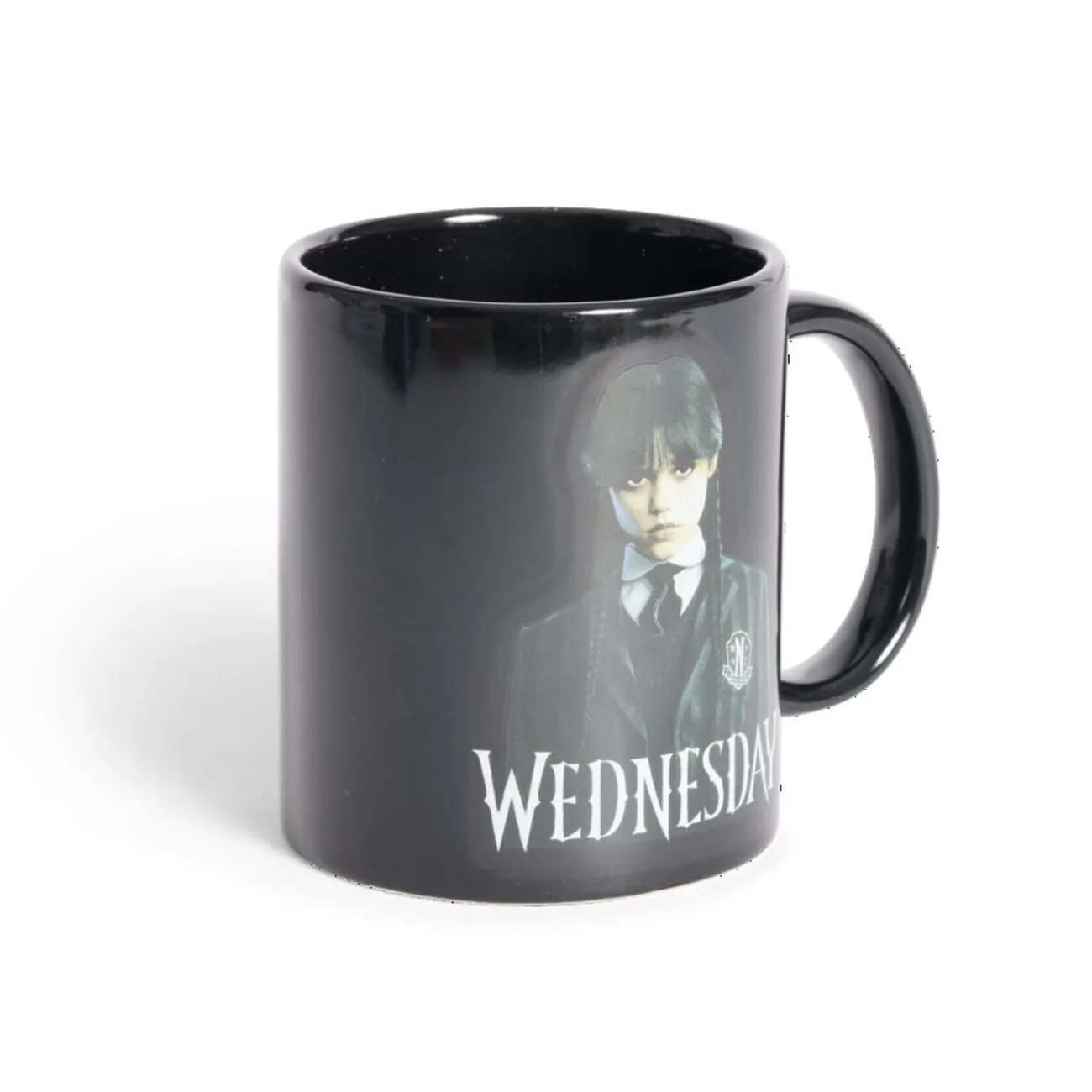 Savourez votre café avec une touche de mystère grâce à ce mug noir orné de l’inscription « Wednesday » et d’une sérigraphie du personnage emblématique Mercredi Addams.