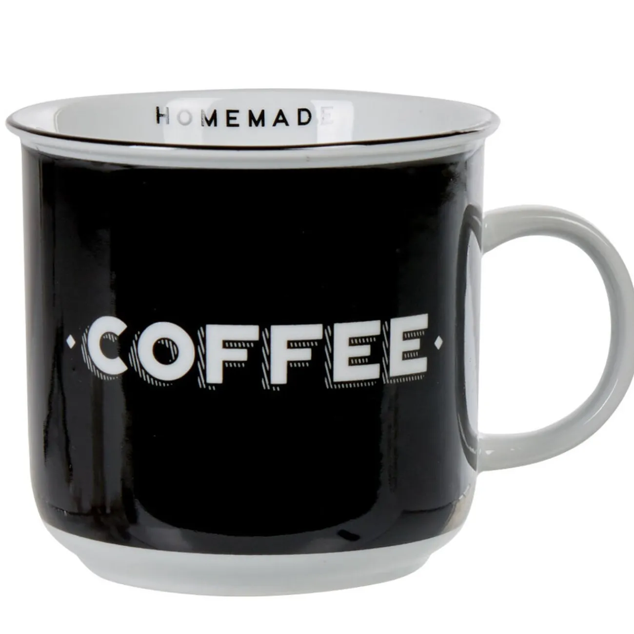 Mug bicolore noir et blanc : anse blanche, intérieur blanc avec inscription « home made » (fait maison), extérieur noir avec inscription « coffee » blanche.