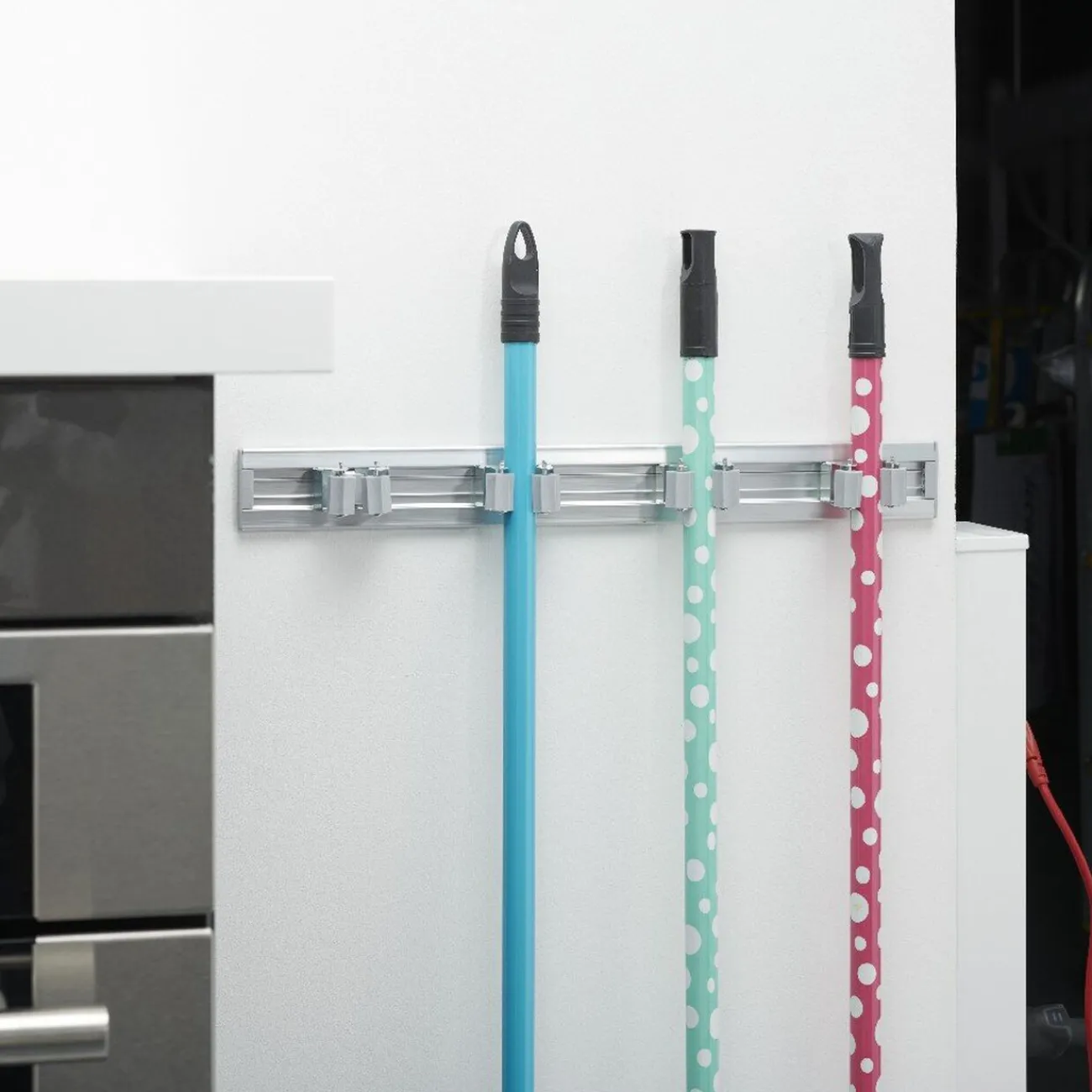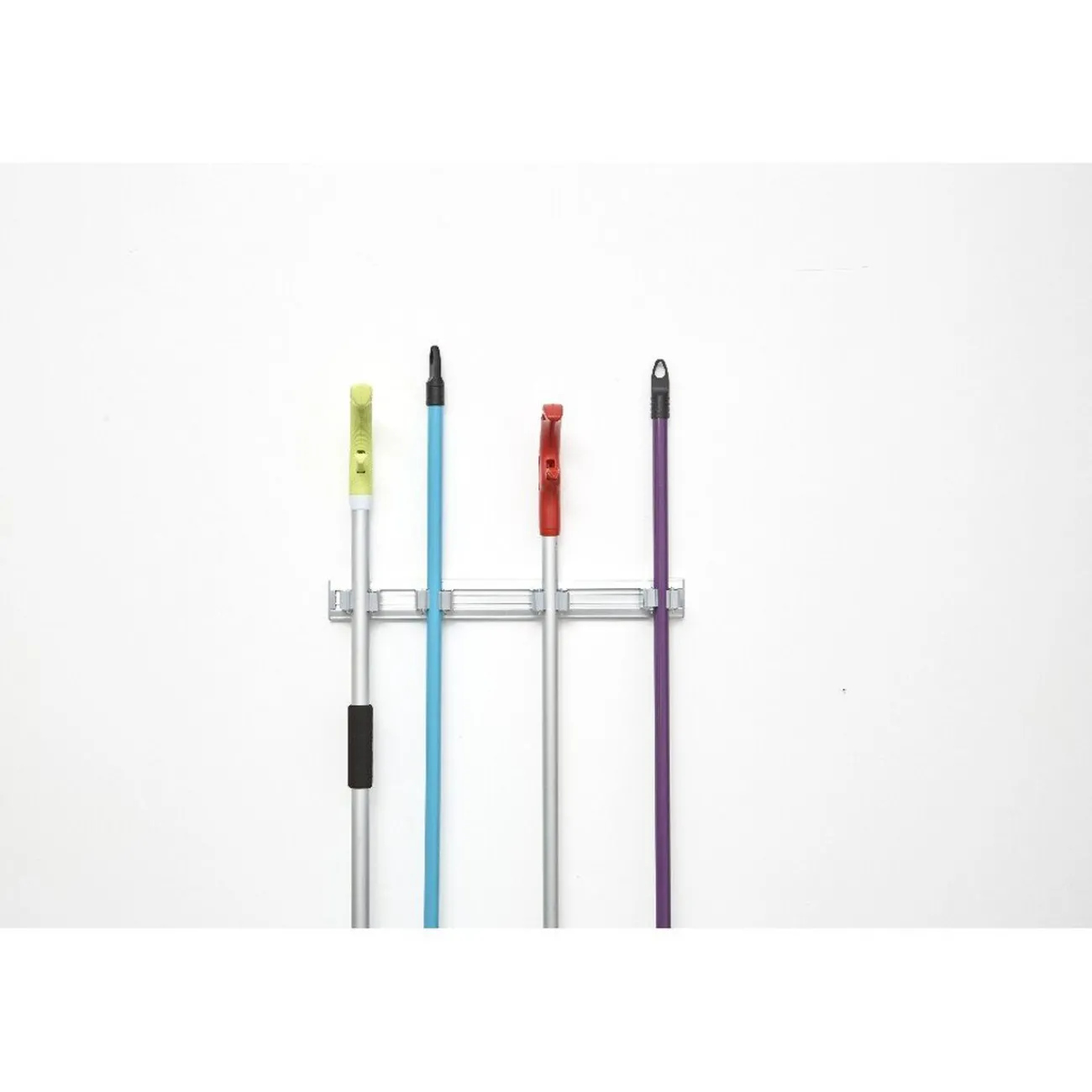 Support mural pour manches à balais comprenant 4 accroches réglables en fonction de la largeur du balai.