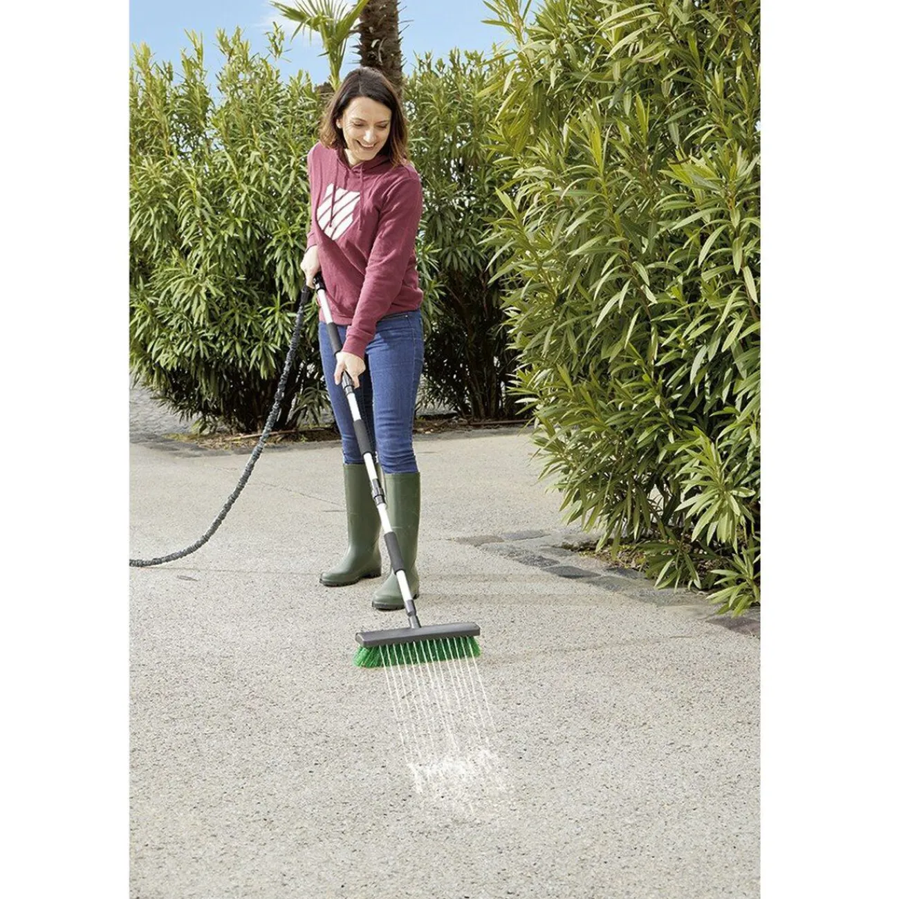 Balai-brosse avec raccord permettant de le brancher directement sur le tuyau d’arrosage.