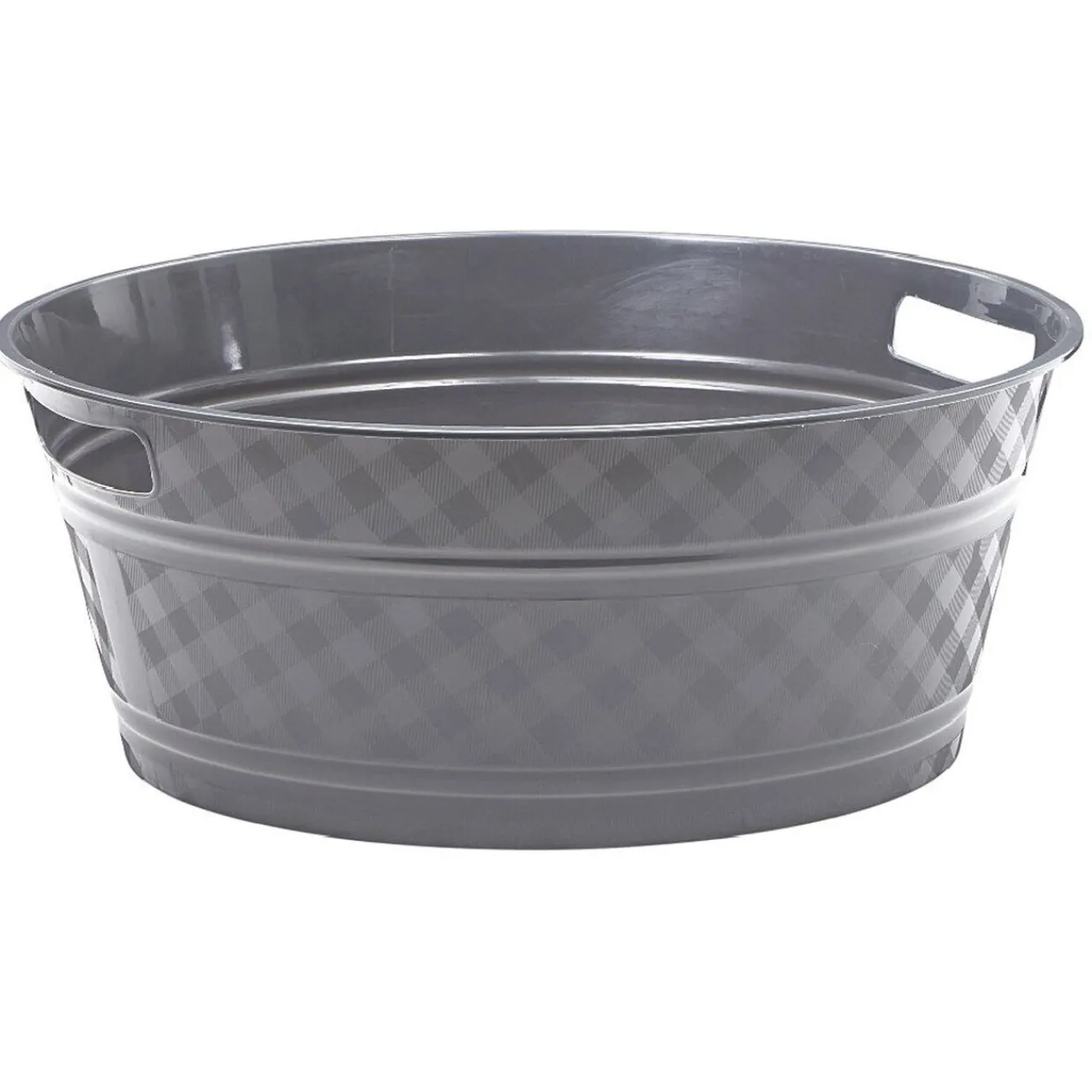 Bassine souple ronde de couleur gris uni à l’intérieur et motifs quadrillés à l’extérieur.