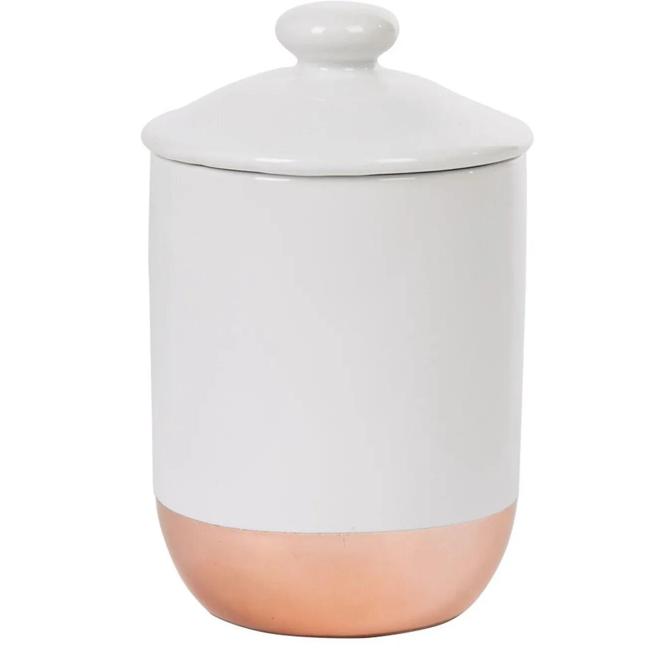 Poubelle à coton pour la salle de bain en céramique bicolore blanc et rose gold.