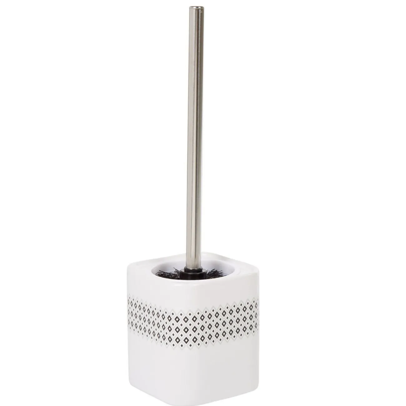 Brosse WC avec manche gris chromé et socle au design graphique de couleur noir et blanc.