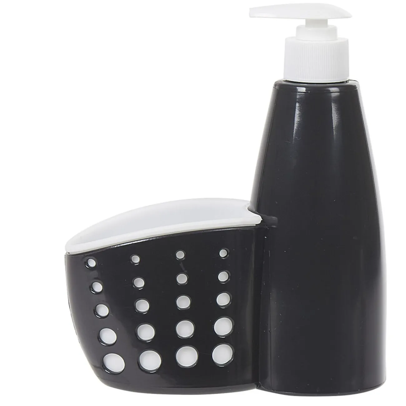 Très pratique et décoratif, ce distributeur de liquide vaisselle rechargeable noir et blanc avec compartiment à éponge fera tout son effet dans la cuisine sur le rebord de votre évier.