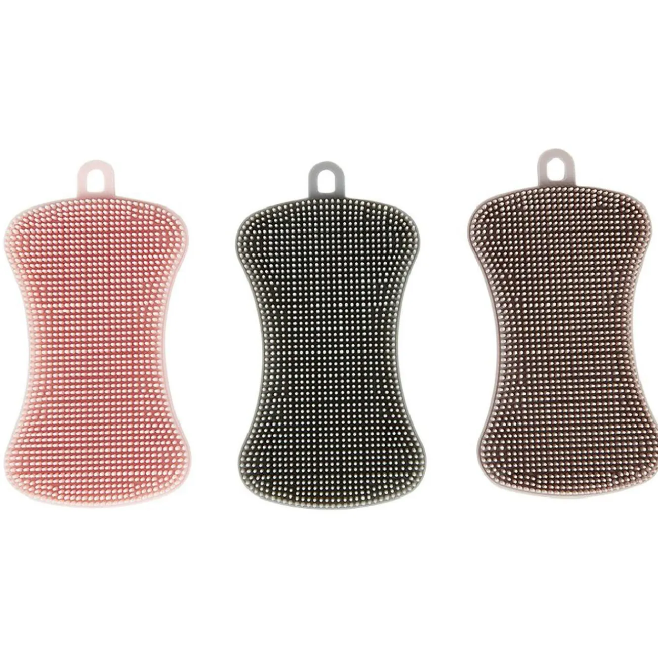 3 éponges en silicone qui s’adaptent facilement à toutes les surfaces, idéales pour la vaisselle ou les poils d’animaux.
