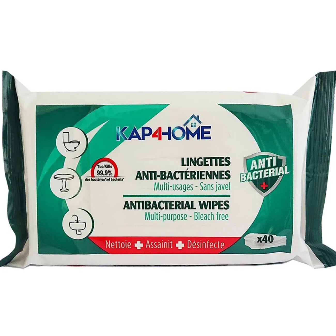 Paquet de 40 lingettes multi-usages anti-bactériennes et sans javel.