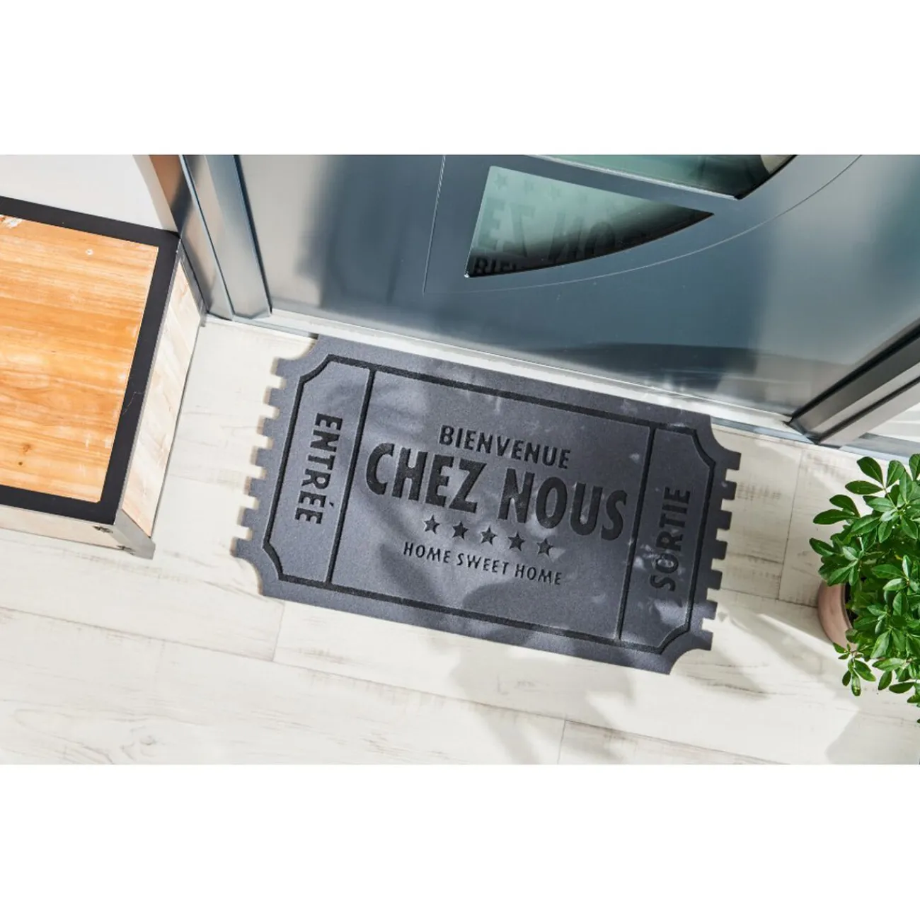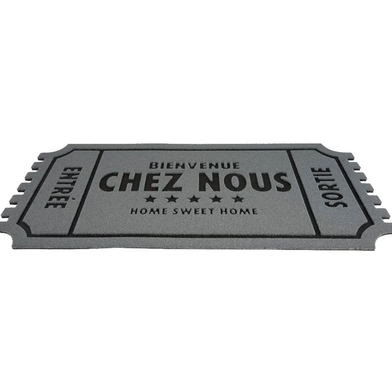 Paillasson gris et noir en forme de ticket avec inscription « bienvenue chez nous ».