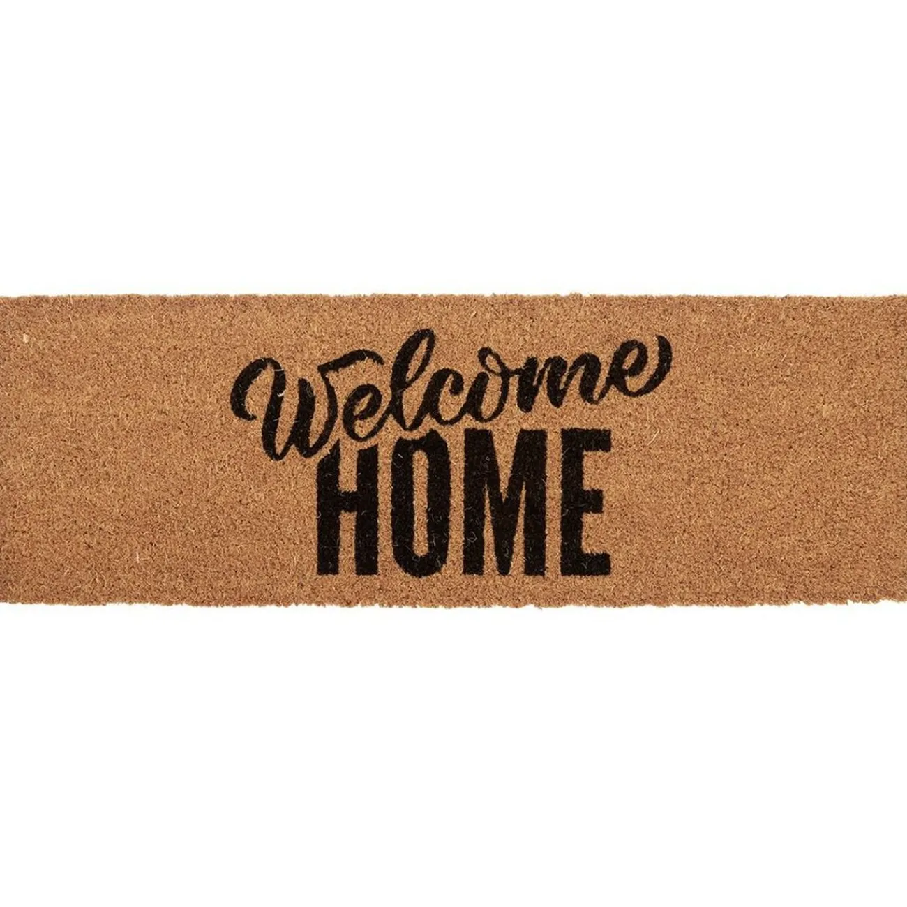 Paillasson en fibre de coco naturel avec inscription « Welcome home ».