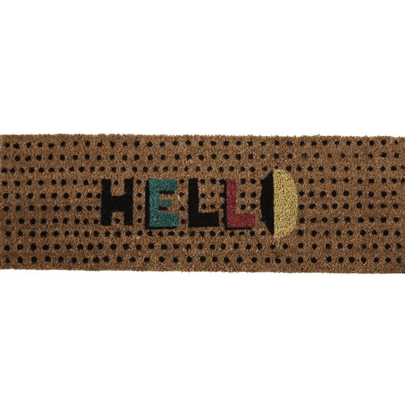 Paillasson rectangulaire avec inscription « hello ».