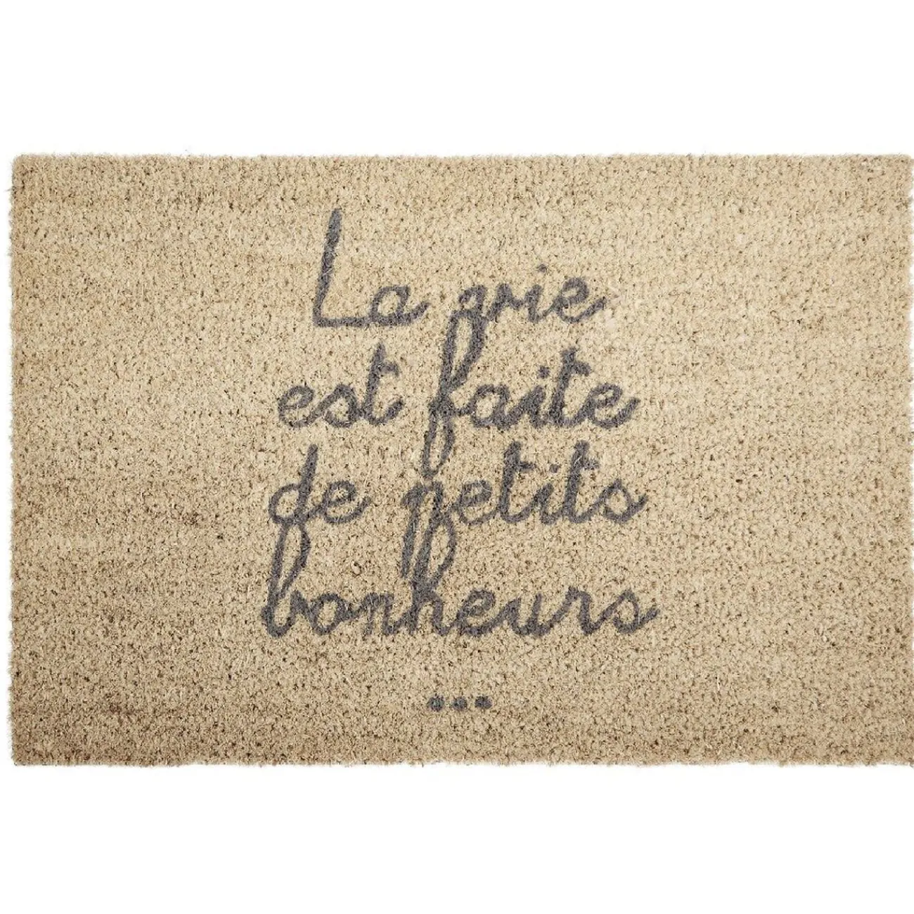 Paillasson beige avec inscription grise « la vie est faite de petits bonheurs… ».