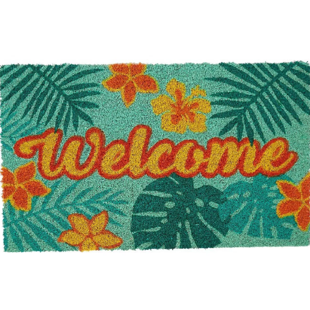 Paillasson bleu motifs feuilles vertes et fleurs de couleur jaune et orange avec inscription « welcome ».