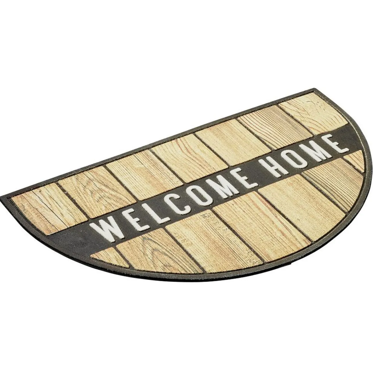 Paillasson demi-lune antidérapant et grattant effet bois avec inscription « Welcome Home » en noir et blanc. Idéal pour une entrée extérieure abritée pour souhaiter la bienvenue à vos invités.