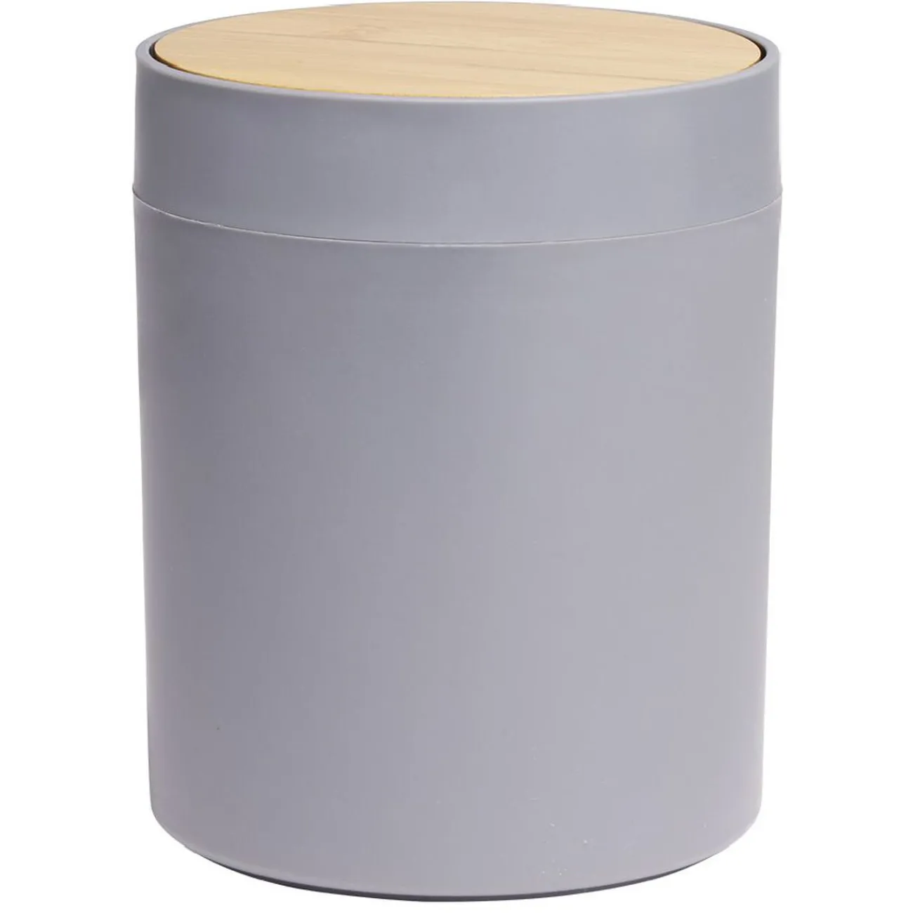 Poubelle à coton ronde 100% aluminium de couleur grise avec couvercle en bambou, design sobre et discret, idéal pour la salle de bain.