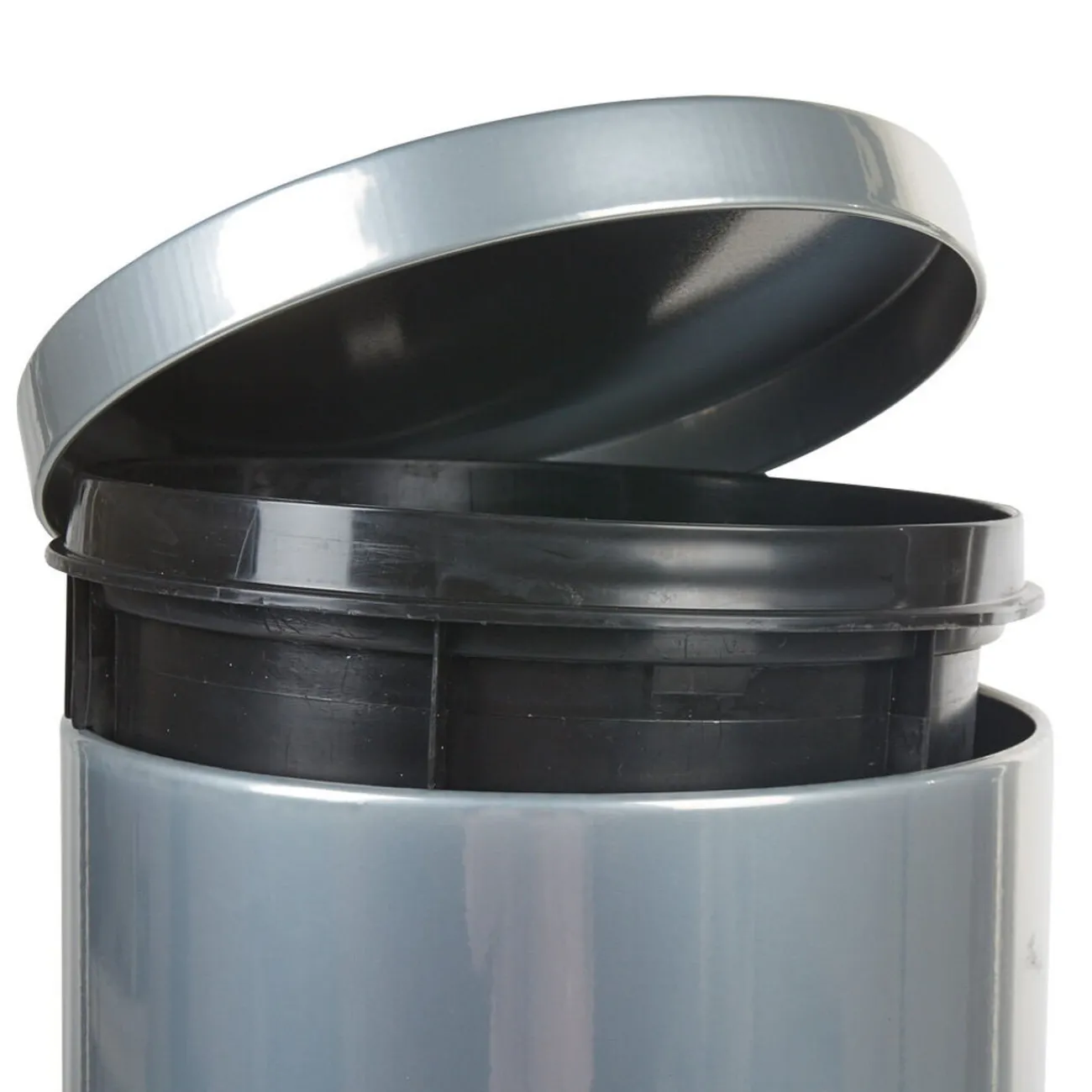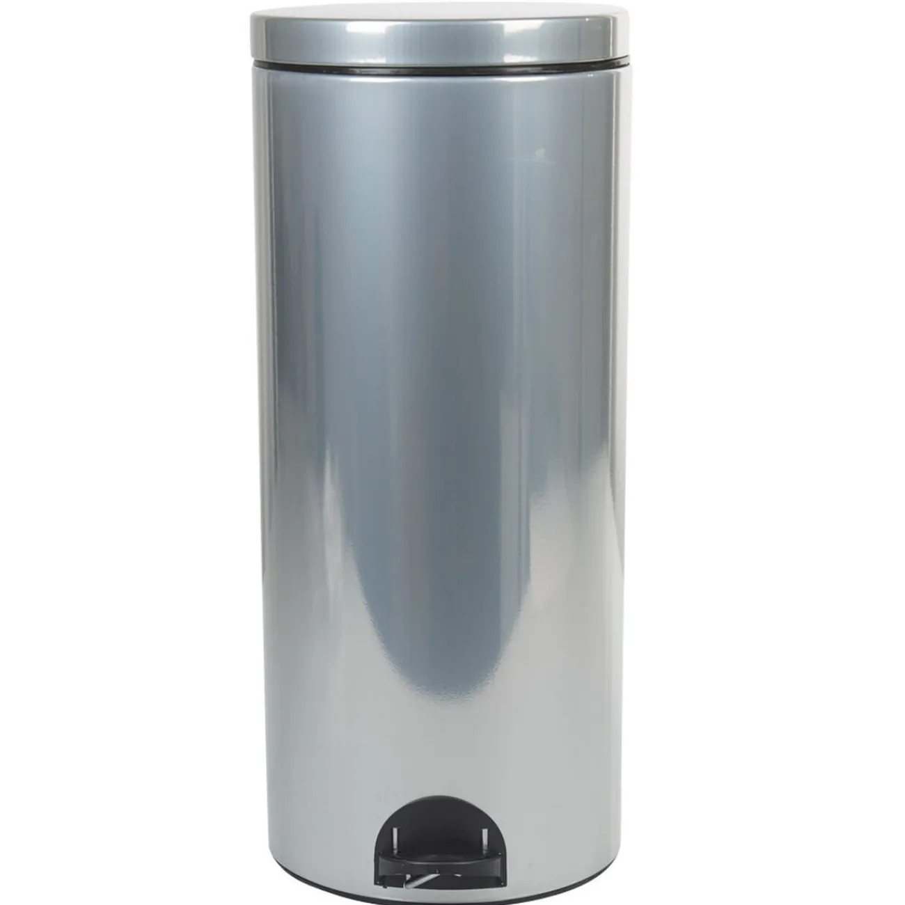 Poubelle à pédale grise en inox et antitrace d’une contenance de 30 L.