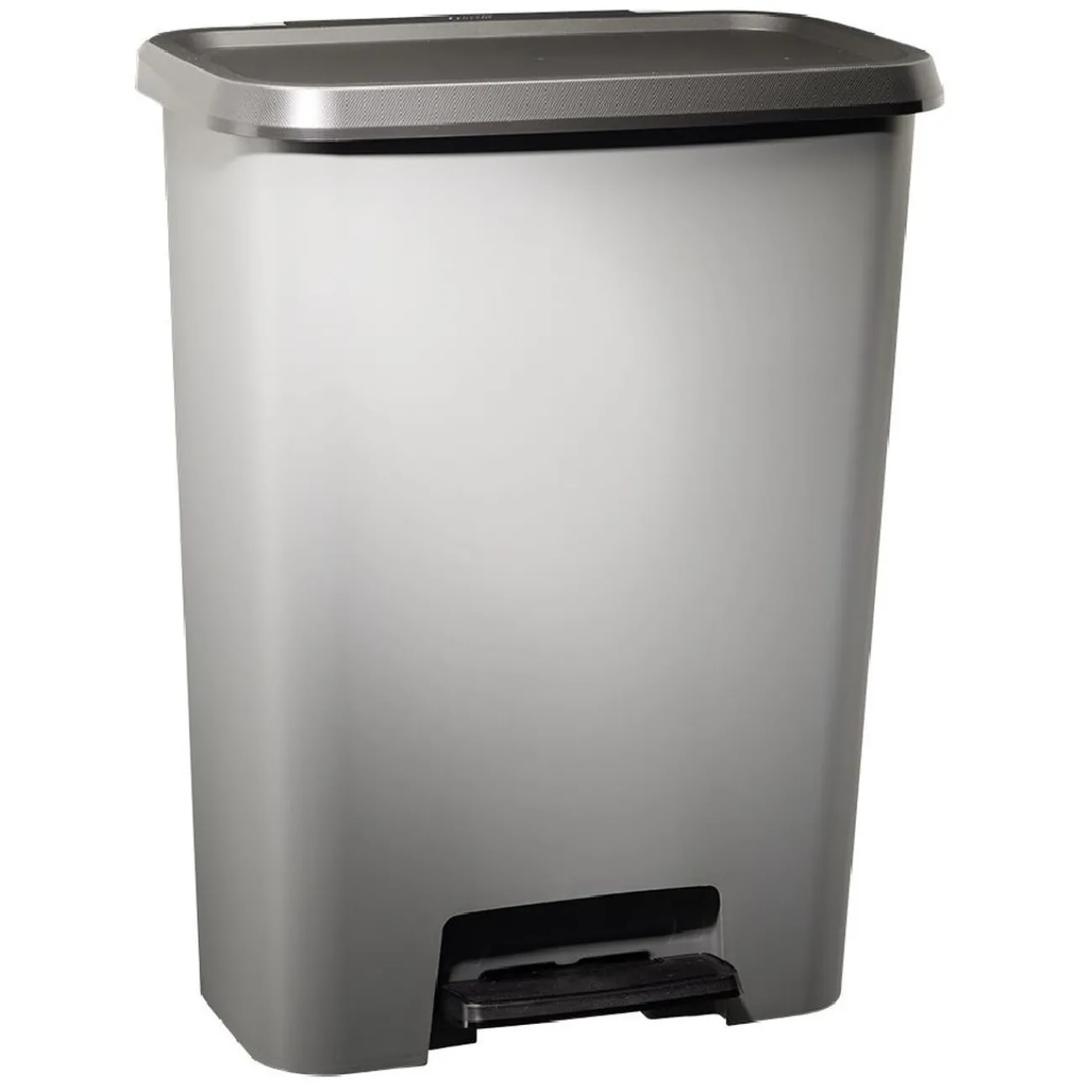 Poubelle de cuisine en plastique gris avec couvercle noir et ouverture à pédale.