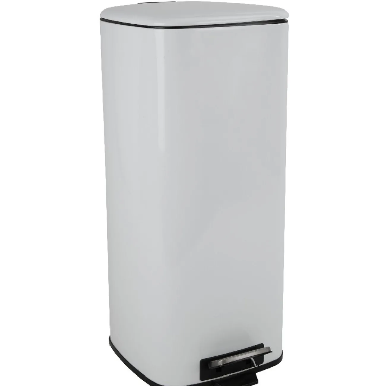 Poubelle à pédale avec frein de chute en métal blanc. De forme rectangulaire, son design compact et moderne se glissera facilement dans la cuisine.