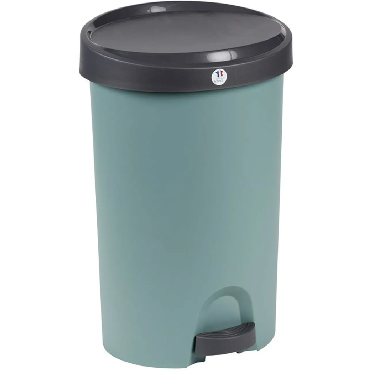 Poubelle à pédale bicolore verte et grise d’une contenance de 27 litres.
