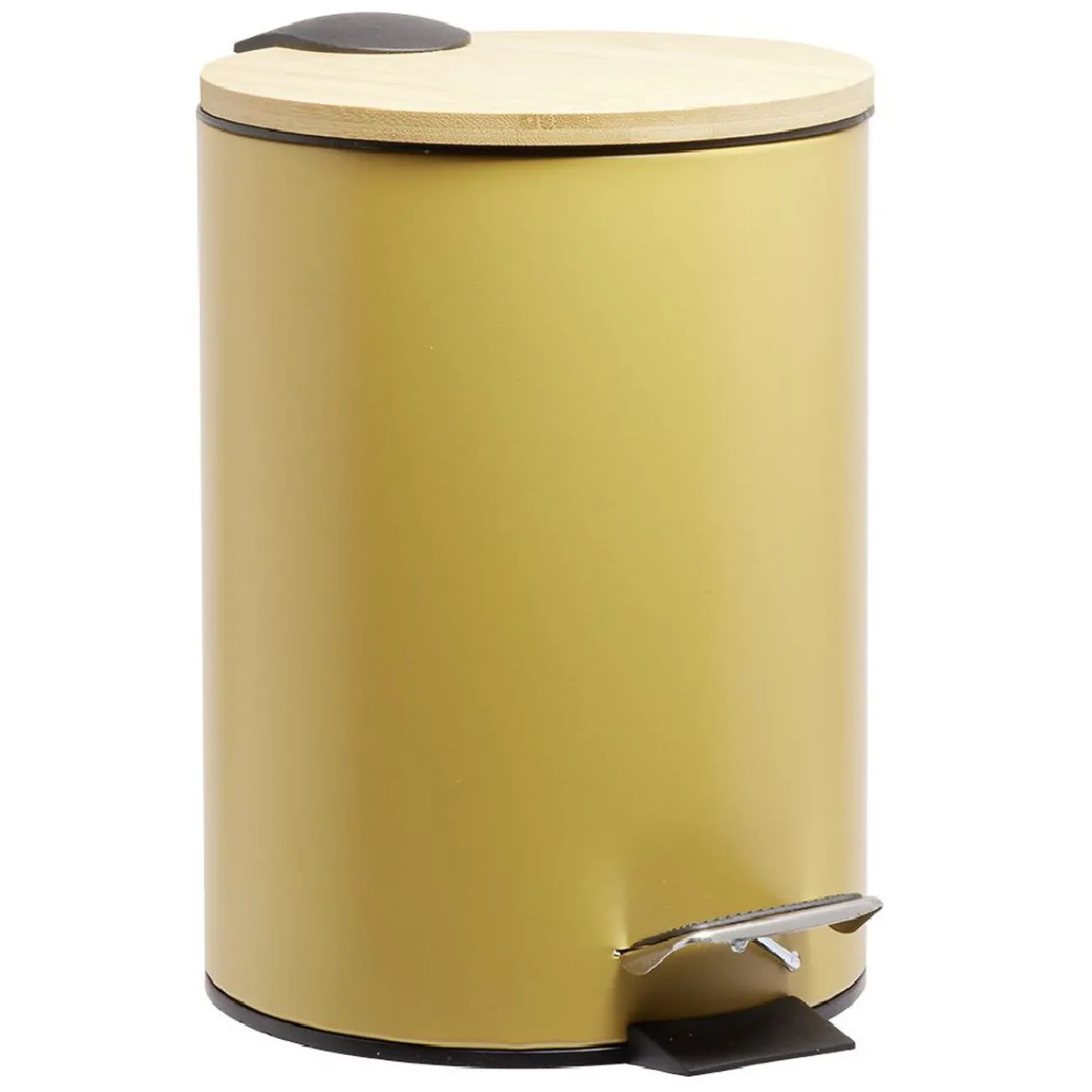 Poubelle de salle de bain jaune en métal avec couvercle en bambou naturel.