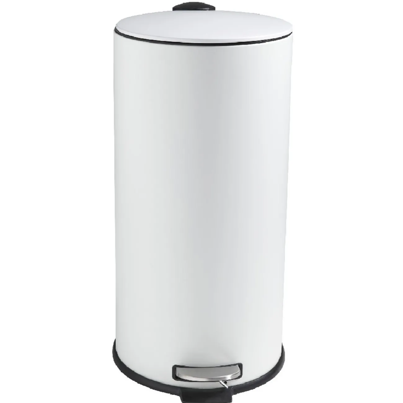 Poubelle ronde à pédale en métal et plastique blanc. Design épuré facile à intégrer dans tous les styles de décorations.