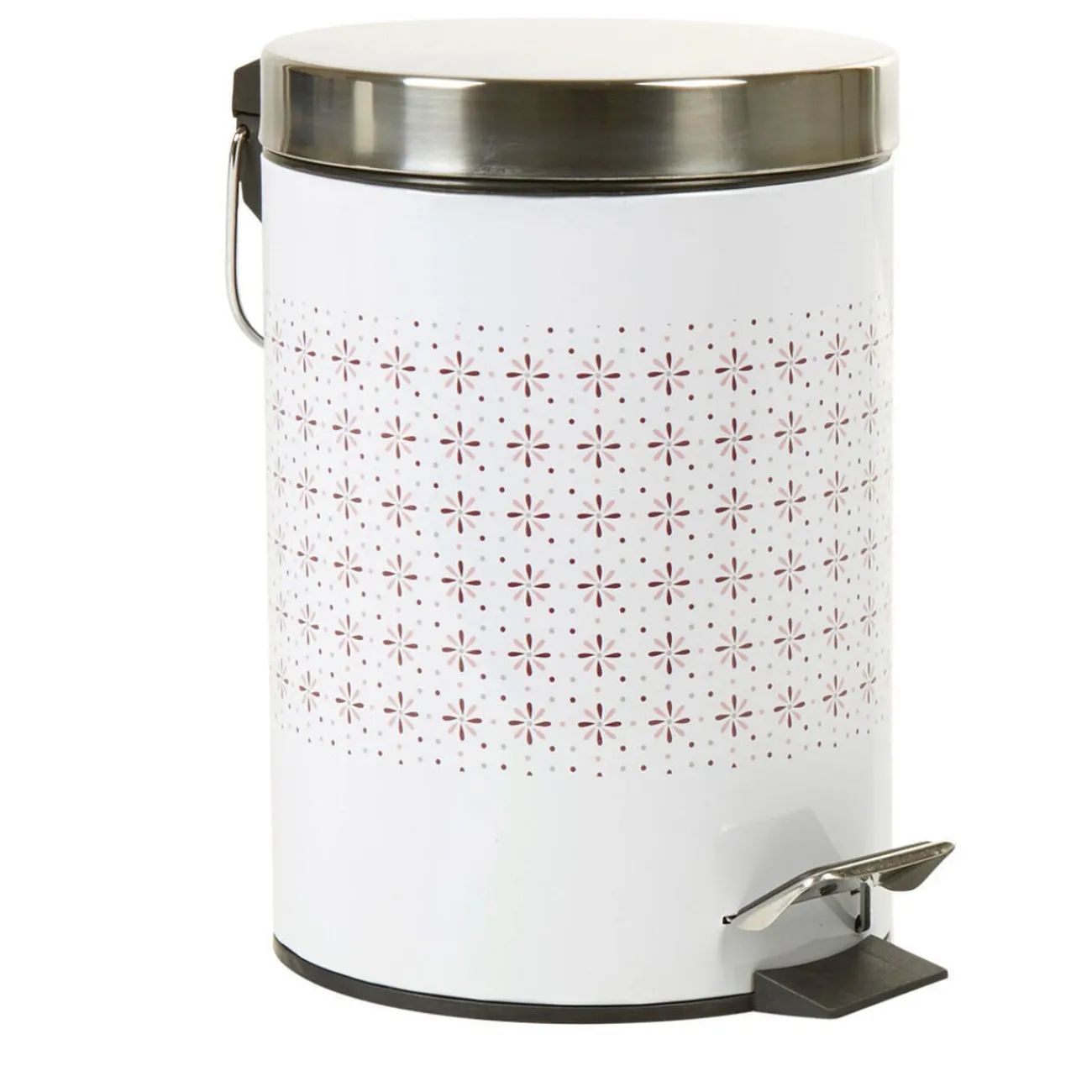 Poubelle de salle de bain blanche motif fleurs, à pédale.