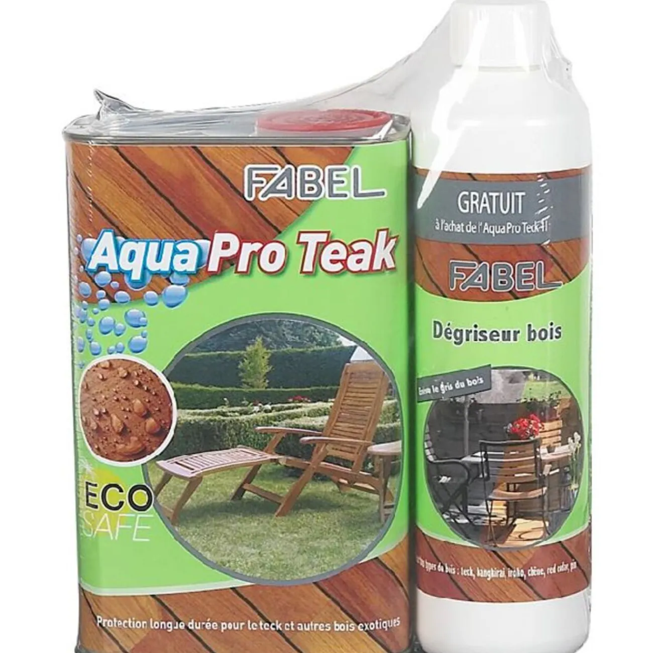 Contient 1 lotion pour la protection du bois 1000 ml et 1 lotion pour dégriser le bois 500 ml.- Protection longue durée pour le teck et autres bois exotiques à base d’eau. Protège contre les tâches et les infiltrations d’eau et ralentit le grisonnement du bois. Formule « Eco Safe » garantie sans solvants pour redonner au mobilier une belle couleur teck tout en respectant la structure du bois. Sans odeurs, facile d’application, séchage rapide.- Dégriseur bois : enlève le gris de tous types de bois : teck, bangkirai, iroko, chêne, red cedar, pin. Permet d’éclaircir également les mobiliers de jardin, terrasses, palissades, bardages, ponts de bateau…Il est efficace sur les tâches foncées dues à l’humidité.