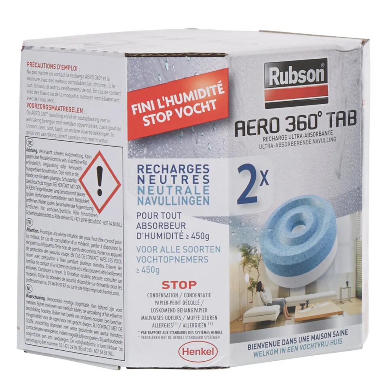 Ce pack de 2 recharges est spécialement conçu pour l’absorbeur d’humidité Rubson Aero 360° vendu sous la référence 500758.