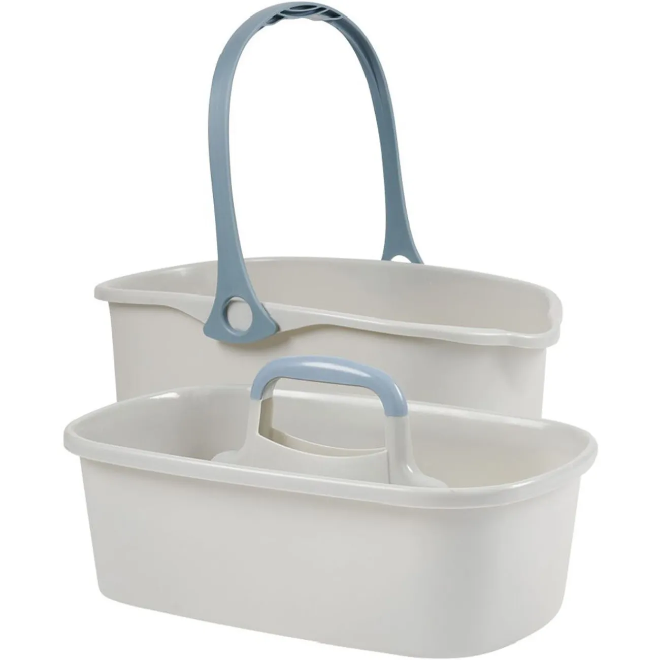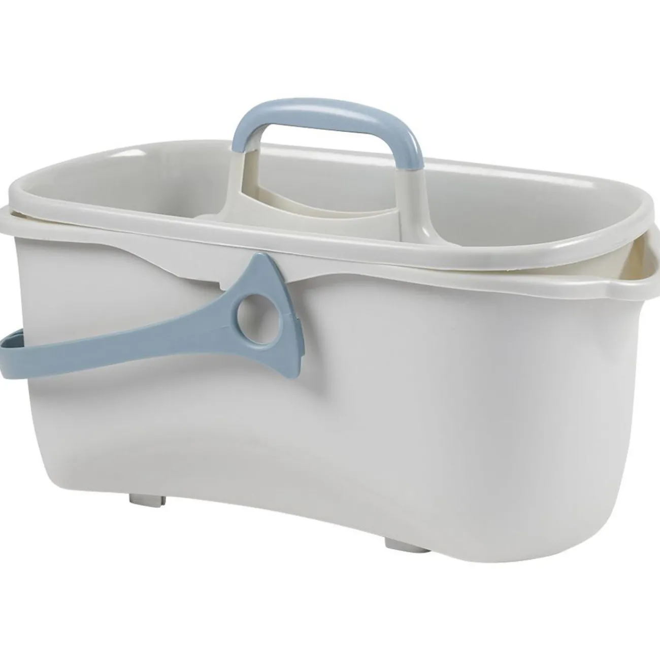 Seau de ménage gris d’une contenance de 11 litres avec anse bleue. Pratique, un panier est fourni avec afin d’être plus facilement mobile lors du transport de vos produits d’entretien.