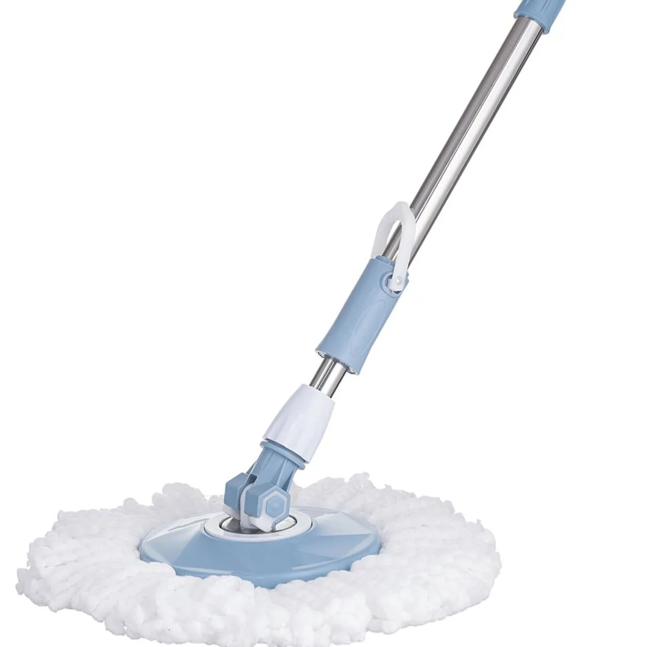 Seau essoreur rétractable bleu-gris et blanc avec balai et serpillère.