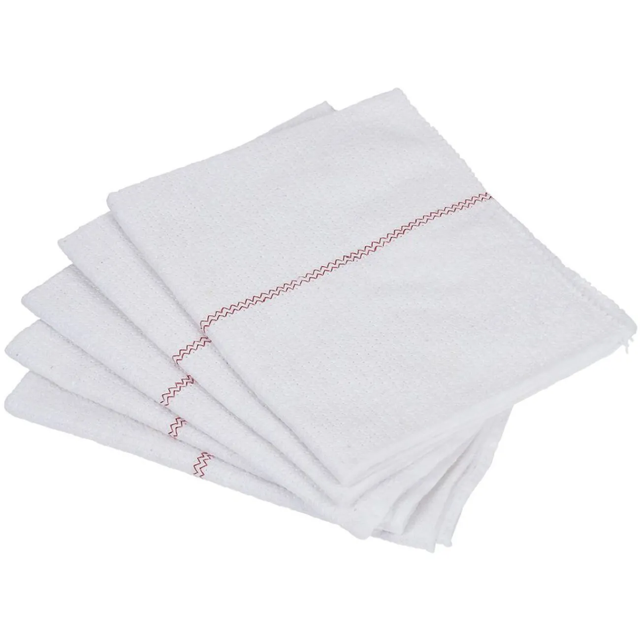 Lot de 5 serpillères en coton blanc décoré de 2 lignes en zig-zag rouges et bleues. Idéale pour les tâches ménagères du quotidien.