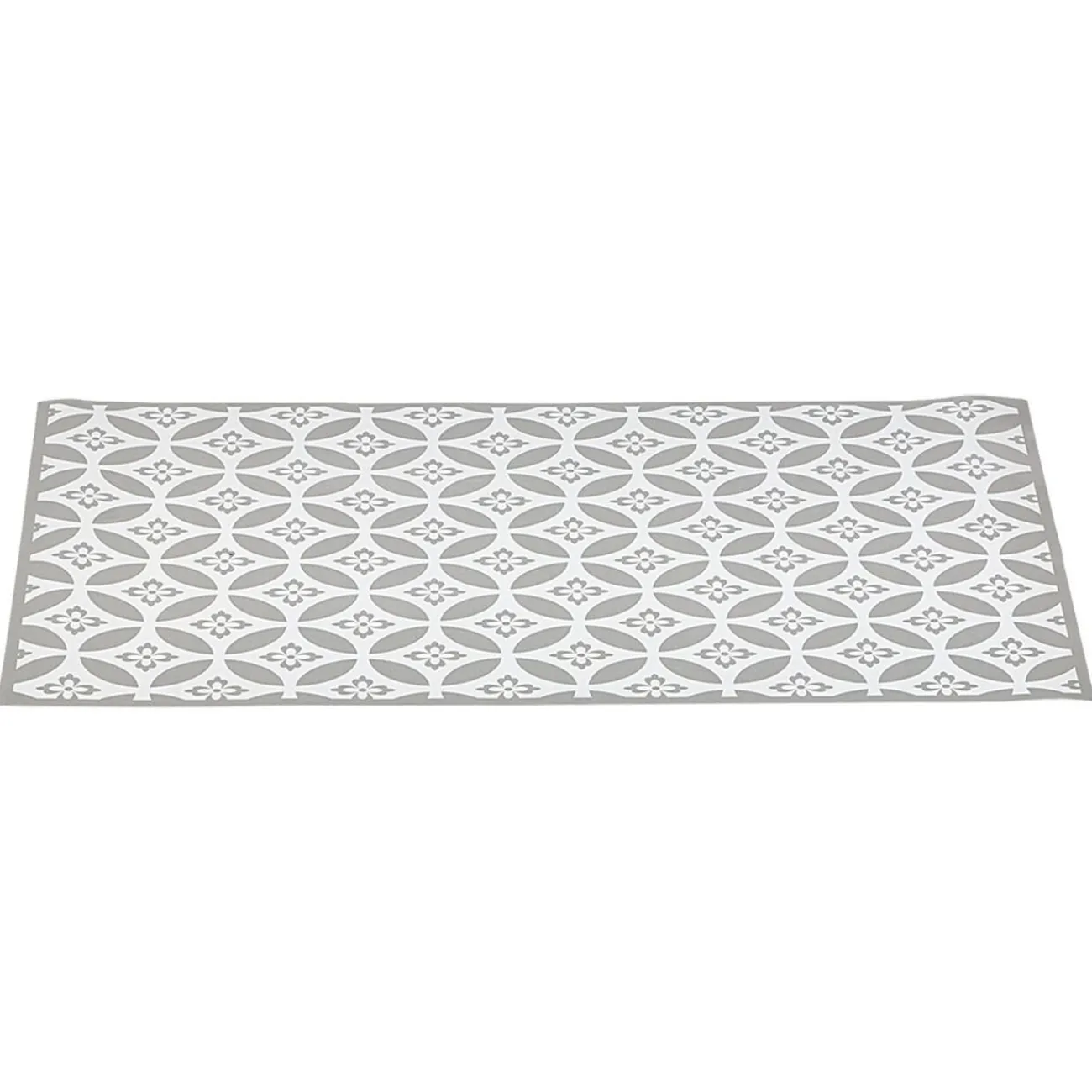 Tapis de cuisine en vinyle rectangulaire imprimé rosace blanc et gris.