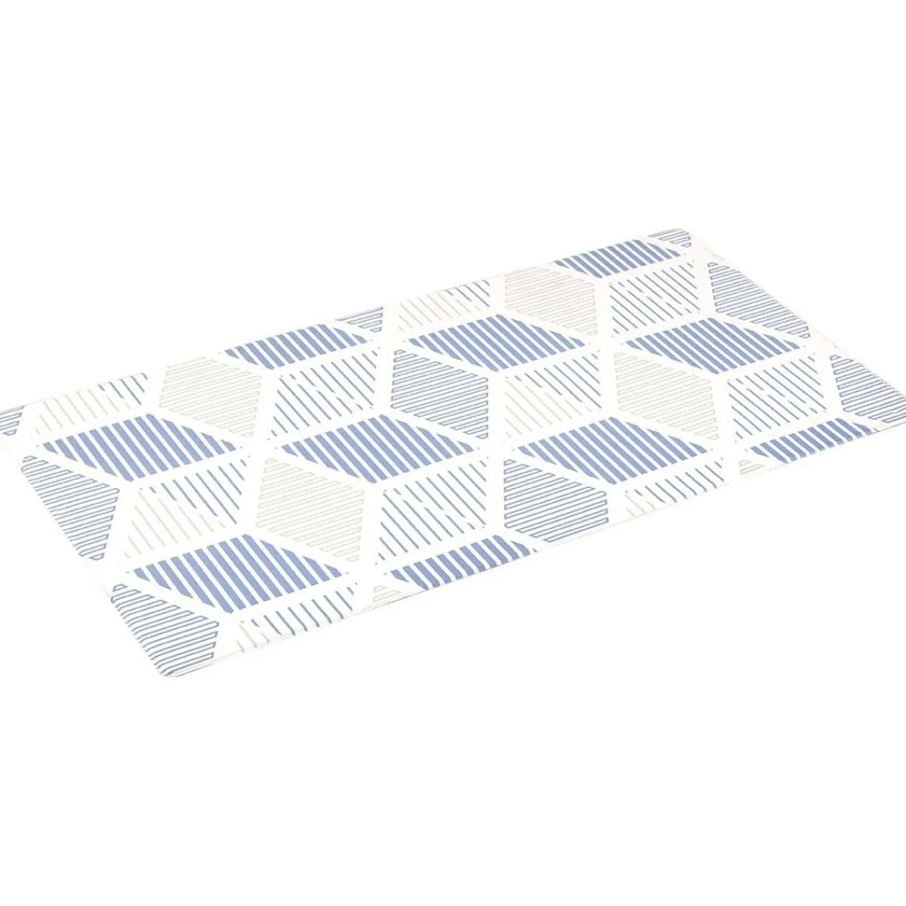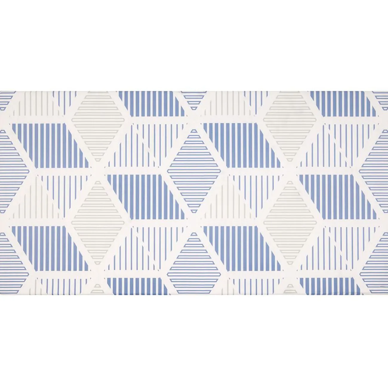 Tapis rectangulaire avec imprimé géométrique bleu et blanc. Idéal dans votre cuisine ou buanderie, avec sa matière vinyle il est très facile d’entretien.
