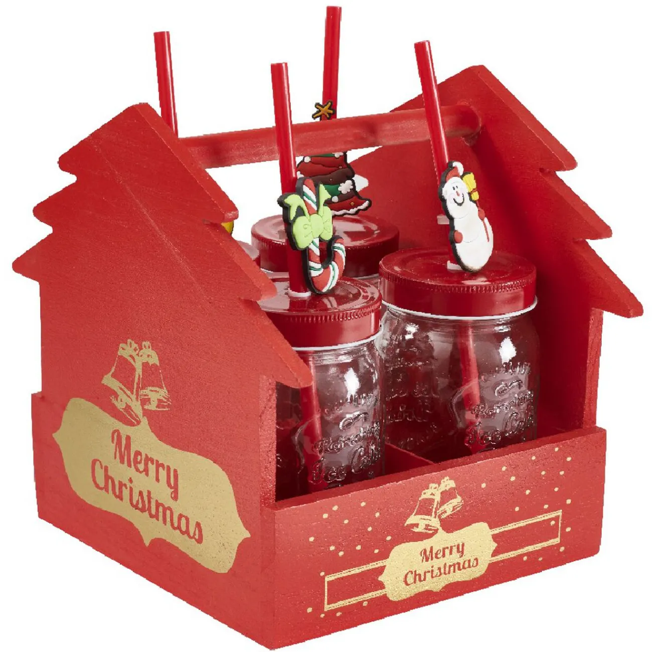 Panier rouge et doré en bois avec inscription « Merry Christmas » et ses 4 emplacements prévus pour recevoir les 4 gobelets inclus avec une paille chacun décorée par une forme de Noël : sapin, Père Noël, sucre d’orge et bonhomme de neige.