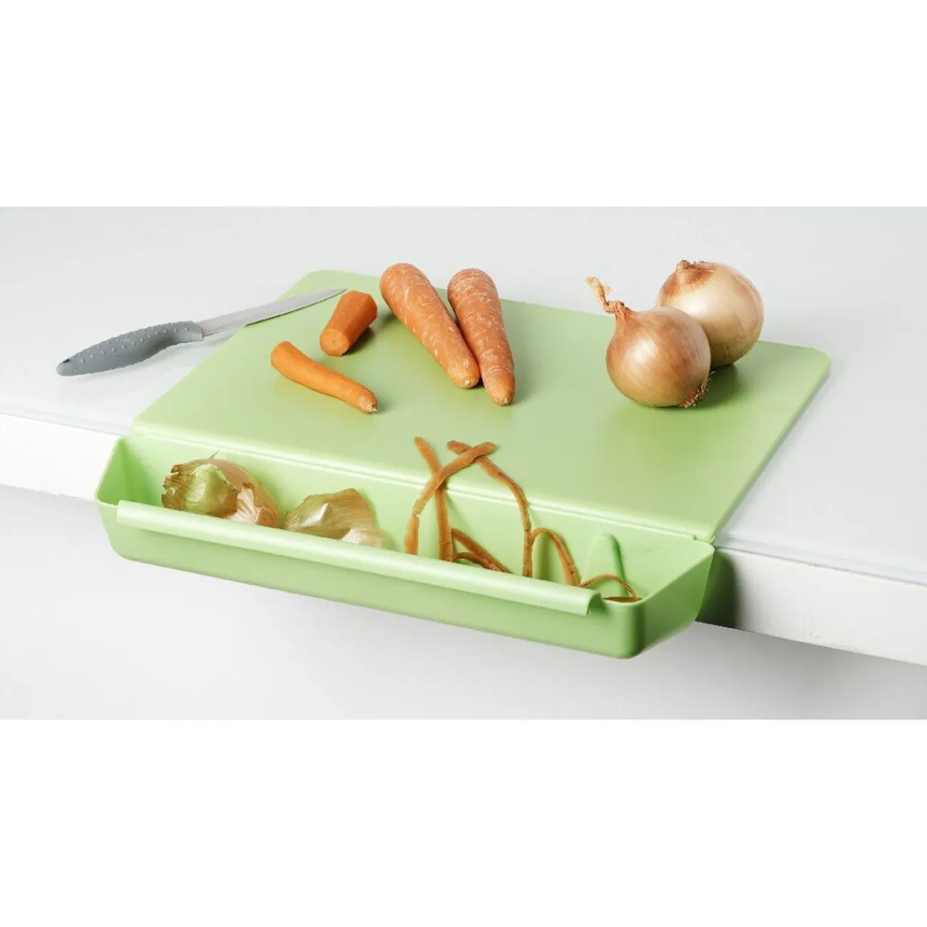 Sert à la fois de planche à découper et de récupérateur d’épluchures.