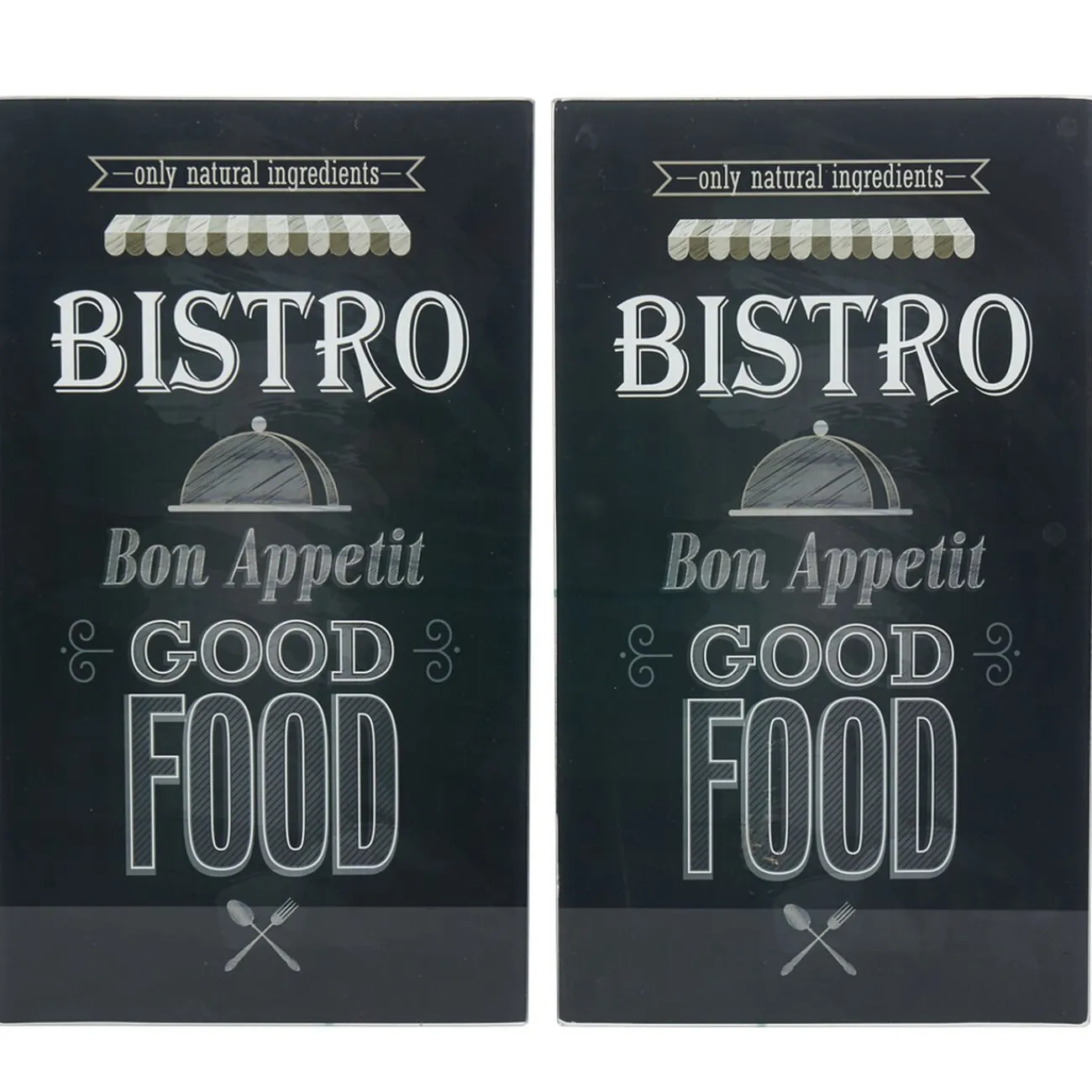Lot de 2 planches à découper cache plaque en verre noir avec inscription blanche pour une cuisine d’inspiration rétro.