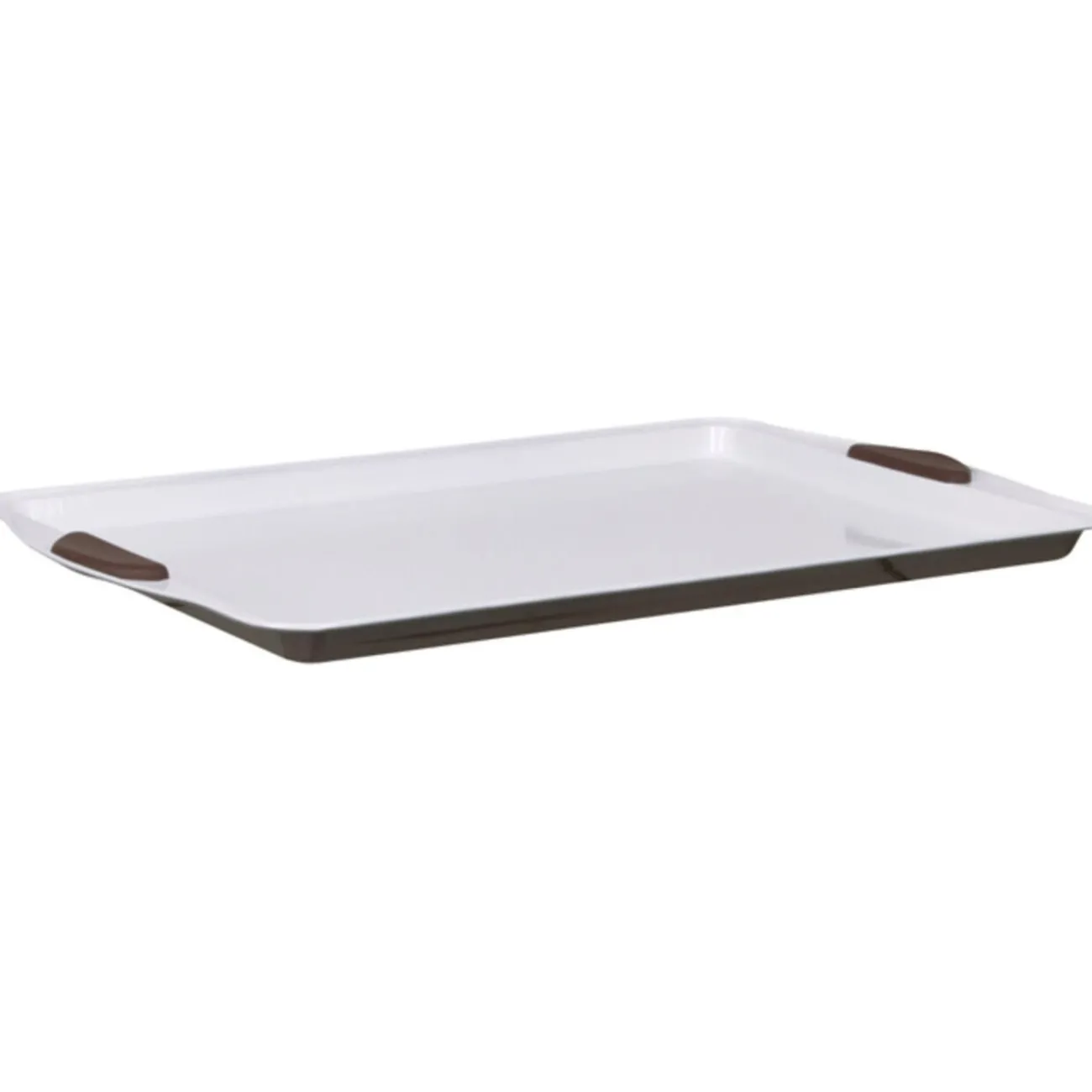 Plaque à four, dim. 49×29 cm, intérieur revêtement céramique, poignée silicone. Coloris : crème et chocolat.
