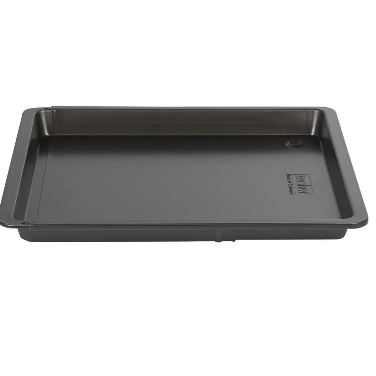 Plaque à pâtisserie rectangulaire en acier avec revêtement anti-adhérent, idéale pour la cuisson de délicieux gâteaux et biscuits faits maison.