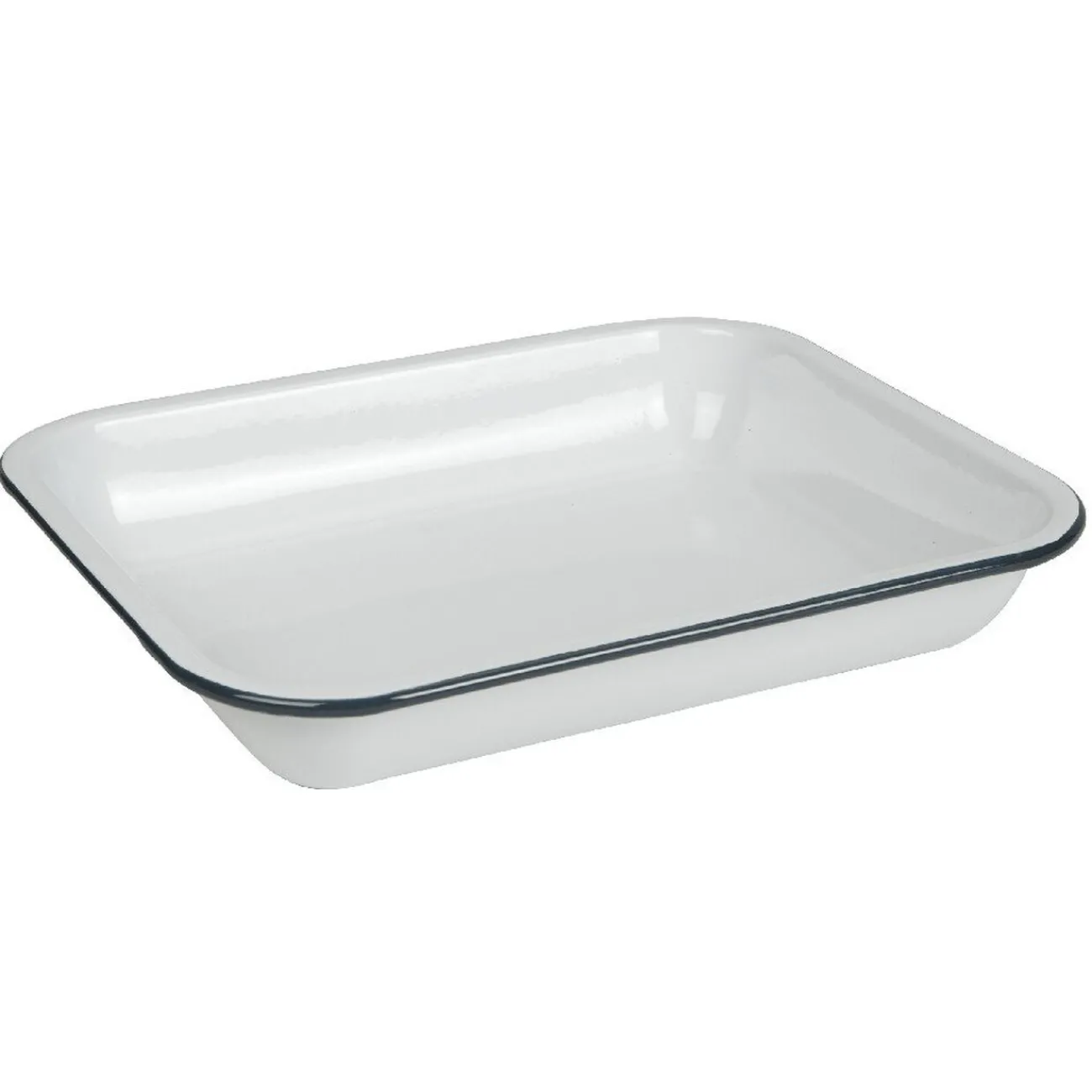 Plat à four en acier émaillé blanc à l’intérieur et bleu sur le contour.